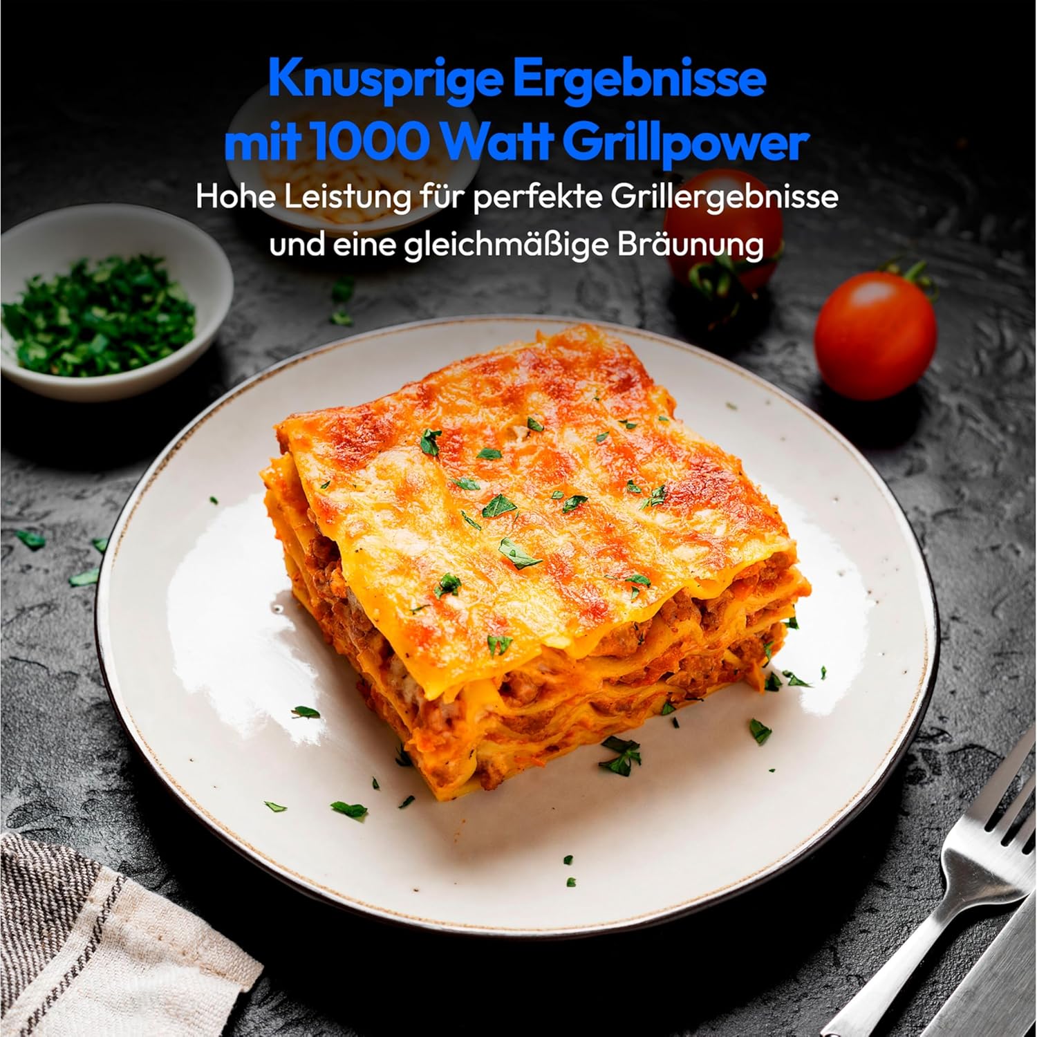 - LEISTUNGSSTARK & VIELSEITIG: 900 W Mikrowellenleistung, 1000 W Grillfunktion und 1680 W Heissluft für schnelles Garen, Grillen und Backen Ihrer Lieblingsgerichte.