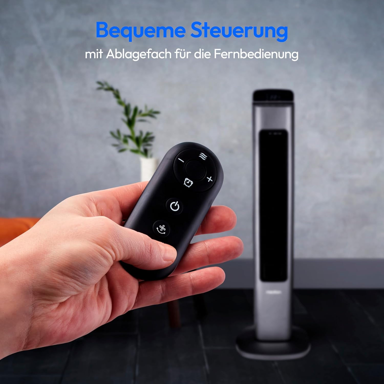 - Turmventilator mit Fernbedienung, 45 Watt Leistung, Oszillationskfunktion, 5 Geschwindigkeitsstufen und Timer-Funktion
