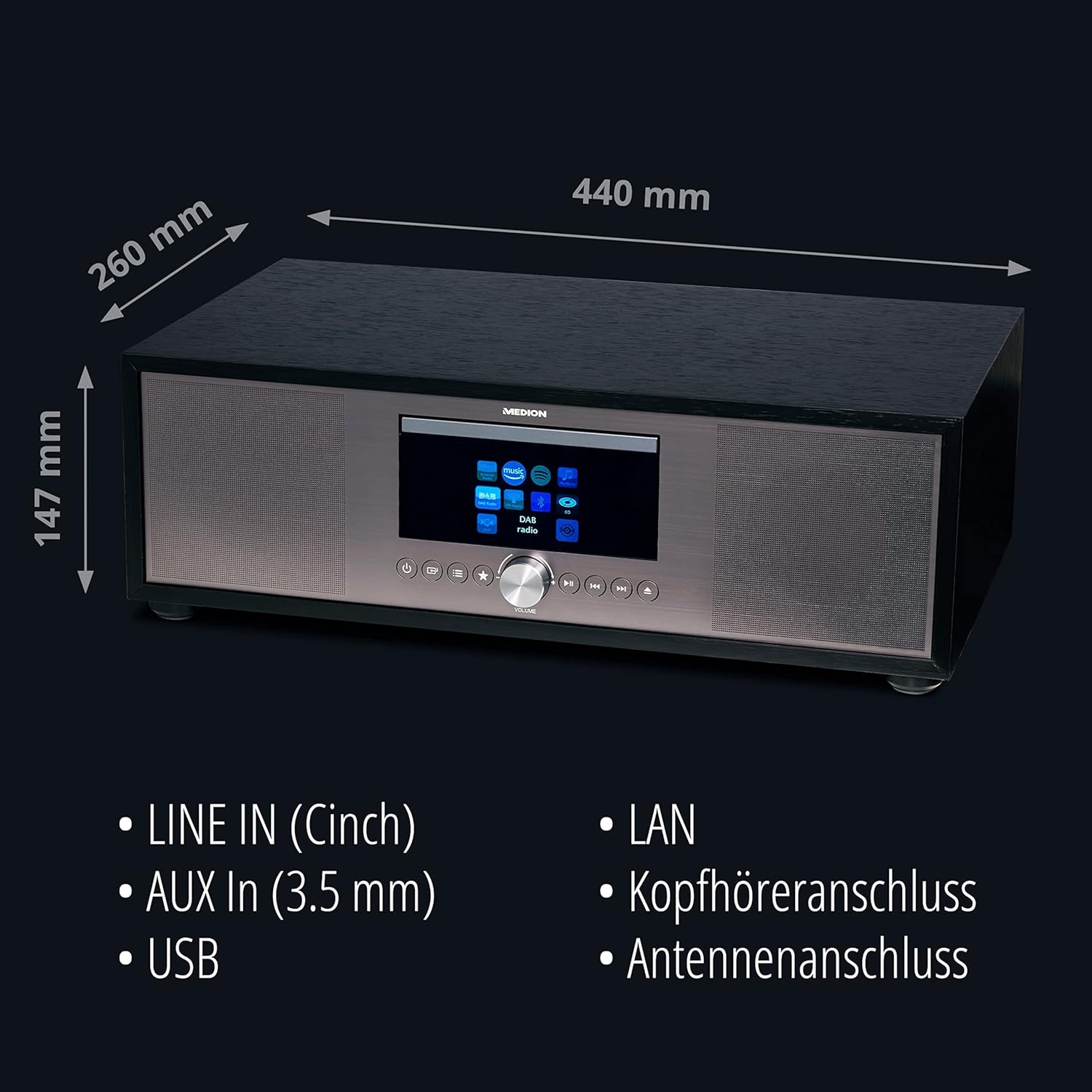 - Lieferumfang: MEDION LIFE MD44100 P66024 AiO Audio-System, Fernbedienung inkl. Batterie, Netzkabel, Bedienungsanleitung, Garantiekarte