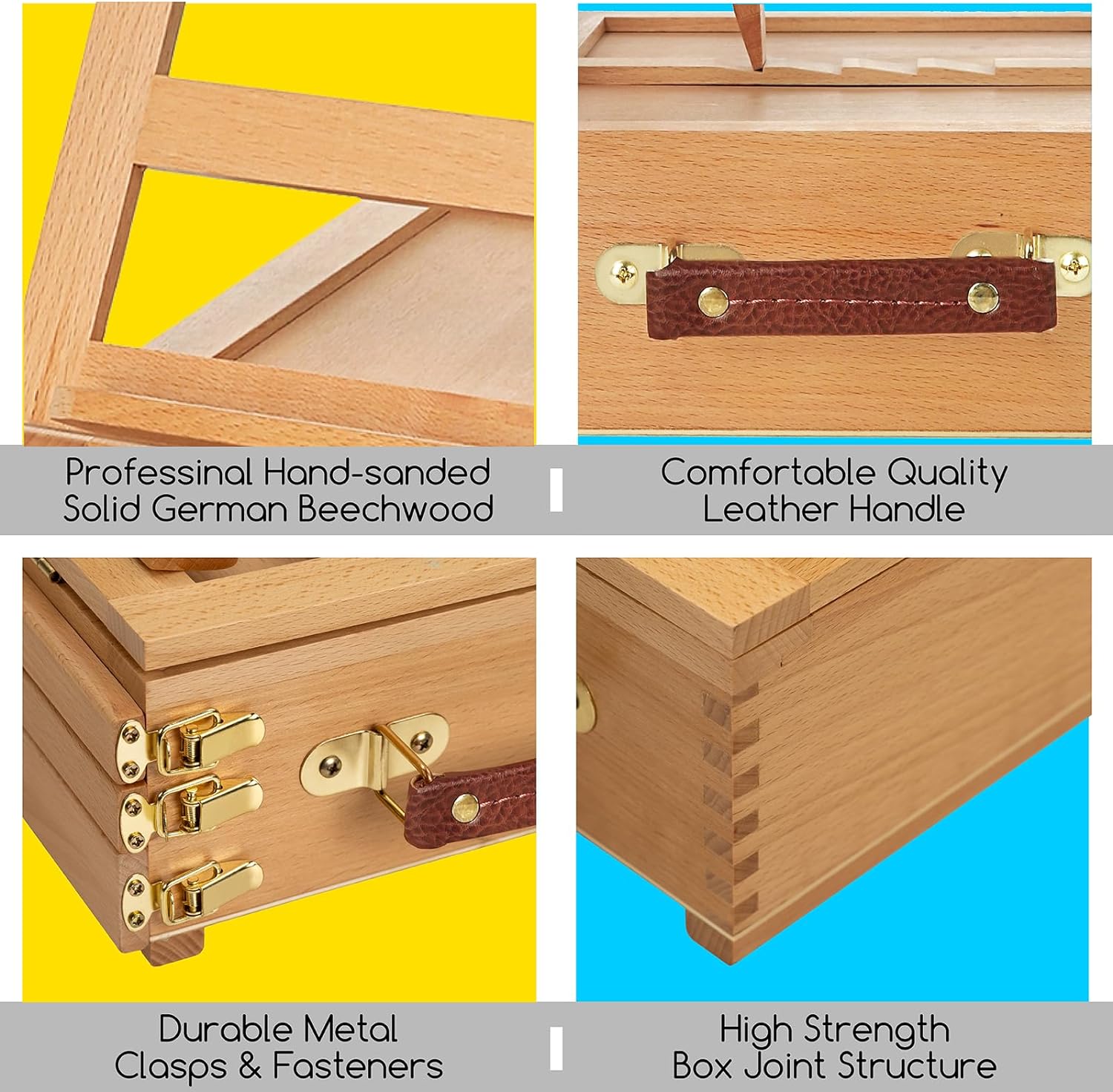 - Aus hochwertigem Buchenholz: Diese hübsche Künstler-Tischstaffelei ist aus hochwertigem, handgeschliffenem Buchenholz, verschliessbare Schubladen haben Schwalbenschwanzkonstruktion, ein schönes Lederband an der Seite.