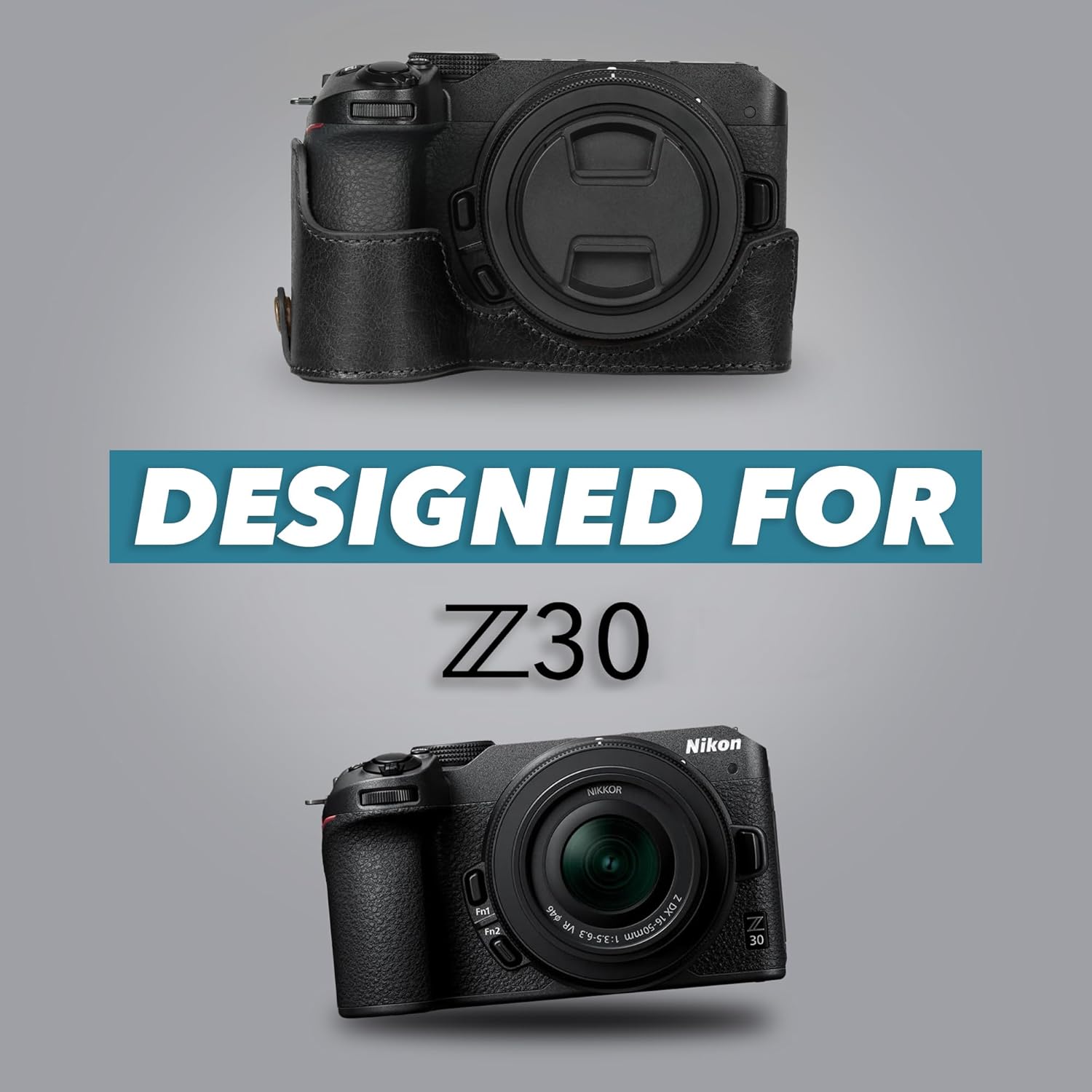 - MASSGESCHNEIDERTE PASSFORM – Die MegaGear Premium-Echtleder-Kamera-Halbtasche mit Batteriefach wurde speziell aus hochwertigem Leder für die Nikon Z30-Modelle für präzise Passform und Schutz zugeschnitten.