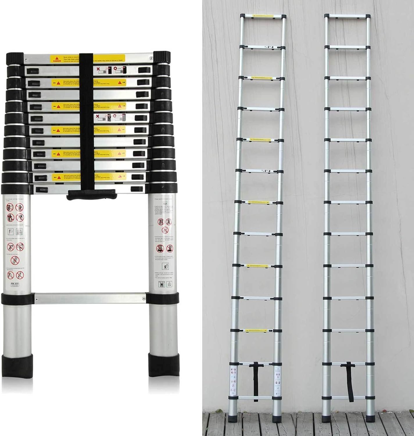 - 3,8 m ausziehbare Teleskopleiter mit 13 Stufen, maximale Belastung bis zu 150 kg, sicher für den Benutzer, um jeden hohen Ort zu erreichen