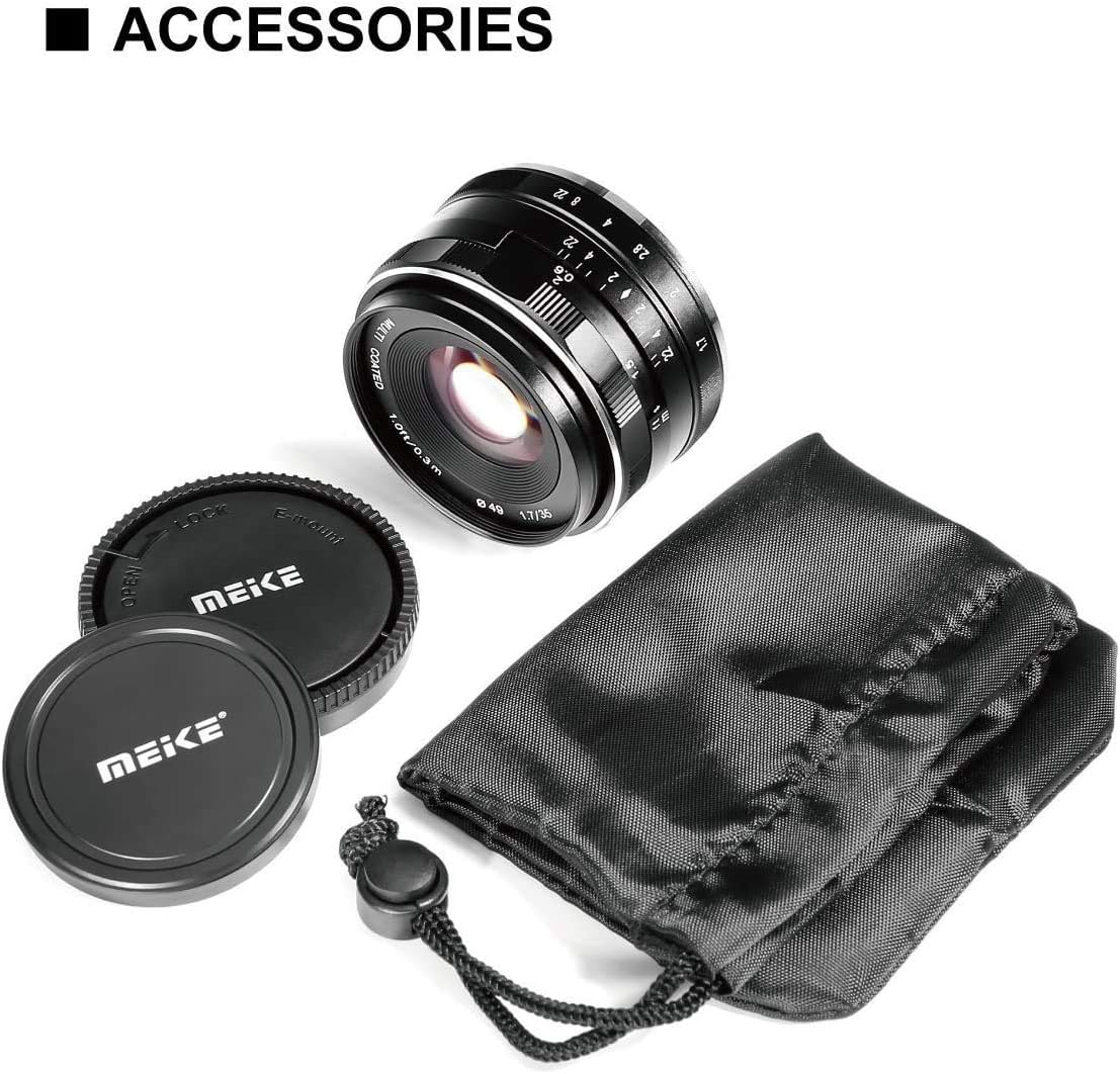 - Meike MK-35 mm F/1.7 ist ein festes, manuelles Objektiv mit einer breiten F/1.7 maximalen Blendenöffnung. Die mattierte Metallkonstruktion macht es resistent gegen Staub und Dampf, während die 6 mehrfach beschichteten Elemente in 5 Gruppen helfen,