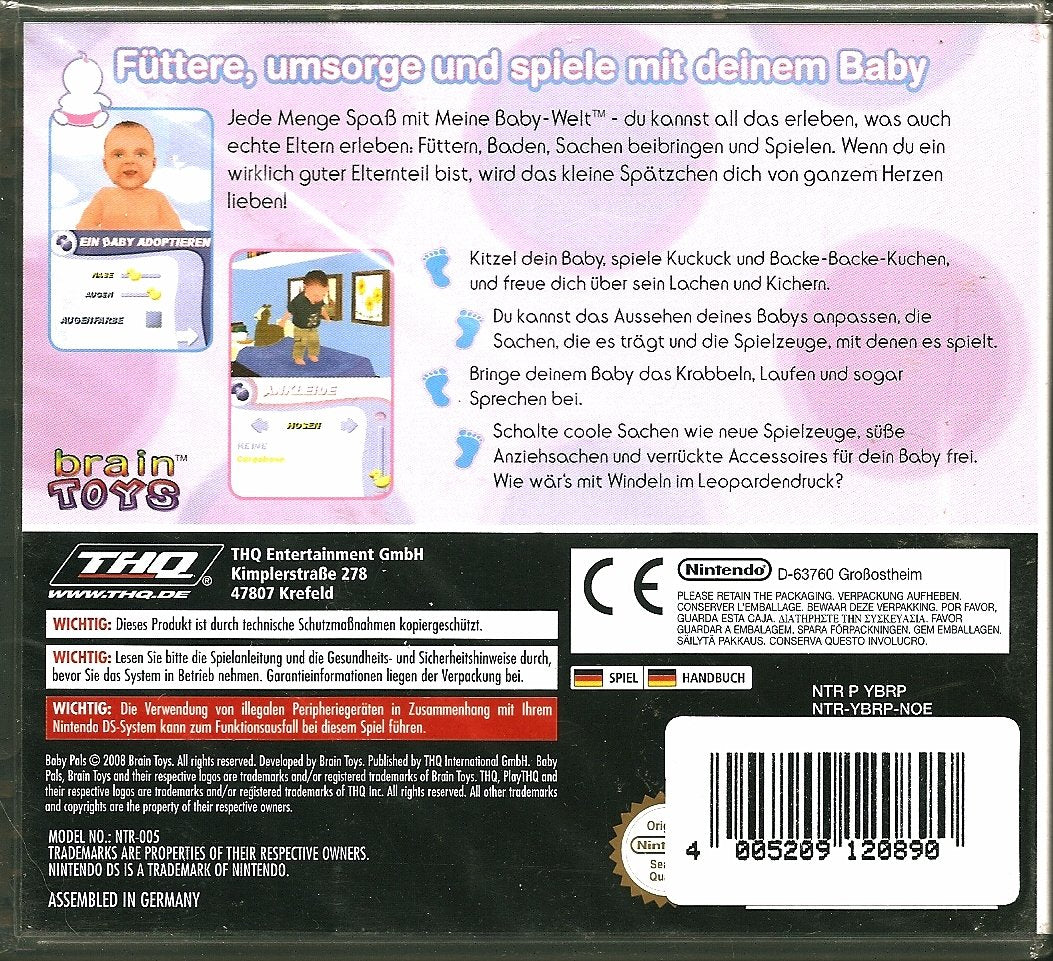 PRODUKTBESCHREIBUNGEN Meine Baby-Welt ist eine lustige interaktive Babysimulation, in der Sie Ihr eigenes interaktives Baby pflegen, einkleiden und erziehen können! Sie übernehmen dabei alle Aufgaben, die auch ein Elternteil im realen Leben erfüllt, wie z. B. füttern, waschen, mit dem Baby spielen und es natürlich auch erziehen! All das können Sie über den innovativen Touchscreen des Nintendo DS steuern. Wie ein guter Vater oder eine gute Mutter kümmern Sie sich in Meine Baby-Welt darum, dass die fünf Grundbedürfnisse des Babys erfüllt werden: Sauberkeit, Nahrung, Liebe, Schlaf und Erziehung. Wenn Sie alles richtig machen, durchläuft das Baby drei aufeinander folgende Entwicklungsstadien, in denen es älter wird und wächst. Ältere Babys werden in ihrem Handeln und ihrem Charakter neue und ganz eigene Züge entwickeln, die auch in der Realität typisch für dieses Alter sind. Features: * Kümmern Sie sich um Ihre eigenes Baby! * Wählen Sie das Geschlecht, Haar- und Augenfarbe sowie vieles mehr! * Erziehen Sie das Baby und kleiden Sie es individuell ein! * Sogar Spielsachen lassen sich im Spiel kaufen und einsetzen! * Spiel komplett in Deutsch.