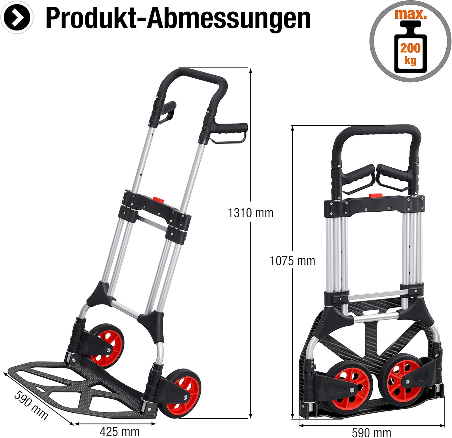 - PRODUKT-DETAILS: Abmessung (eingeklappt / ausgeklappt): 1075 x 590 x 90 mm / 1310 x 615 x 605 mm | Abmessung Ladefläche: 590 x 425 mm | Griffhöhe: 1310 / 1210 / 1040 mm | Rad-Ø: 200 mm | Material Rad: PP / TPR | Material Gestell: Aluminium / Kunststoff
