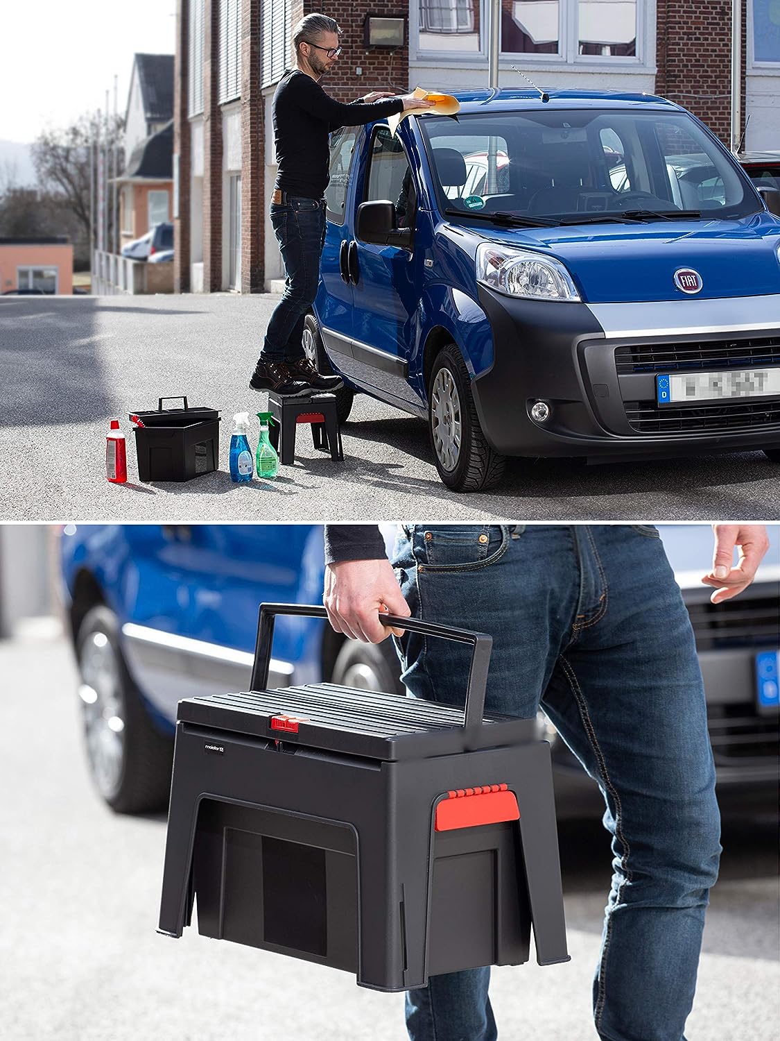 - 3 IN 1-KONZEPT: Drei Bestandteile einzeln und kombiniert nutzbar | Robuster Tritthocker, grosse Werkzeugkiste und praktische Einlageschale | Das Verschlussystem zur schnellen und sicheren Verbindung der Einzelteile | Grosser Klappbügel zum Transportieren