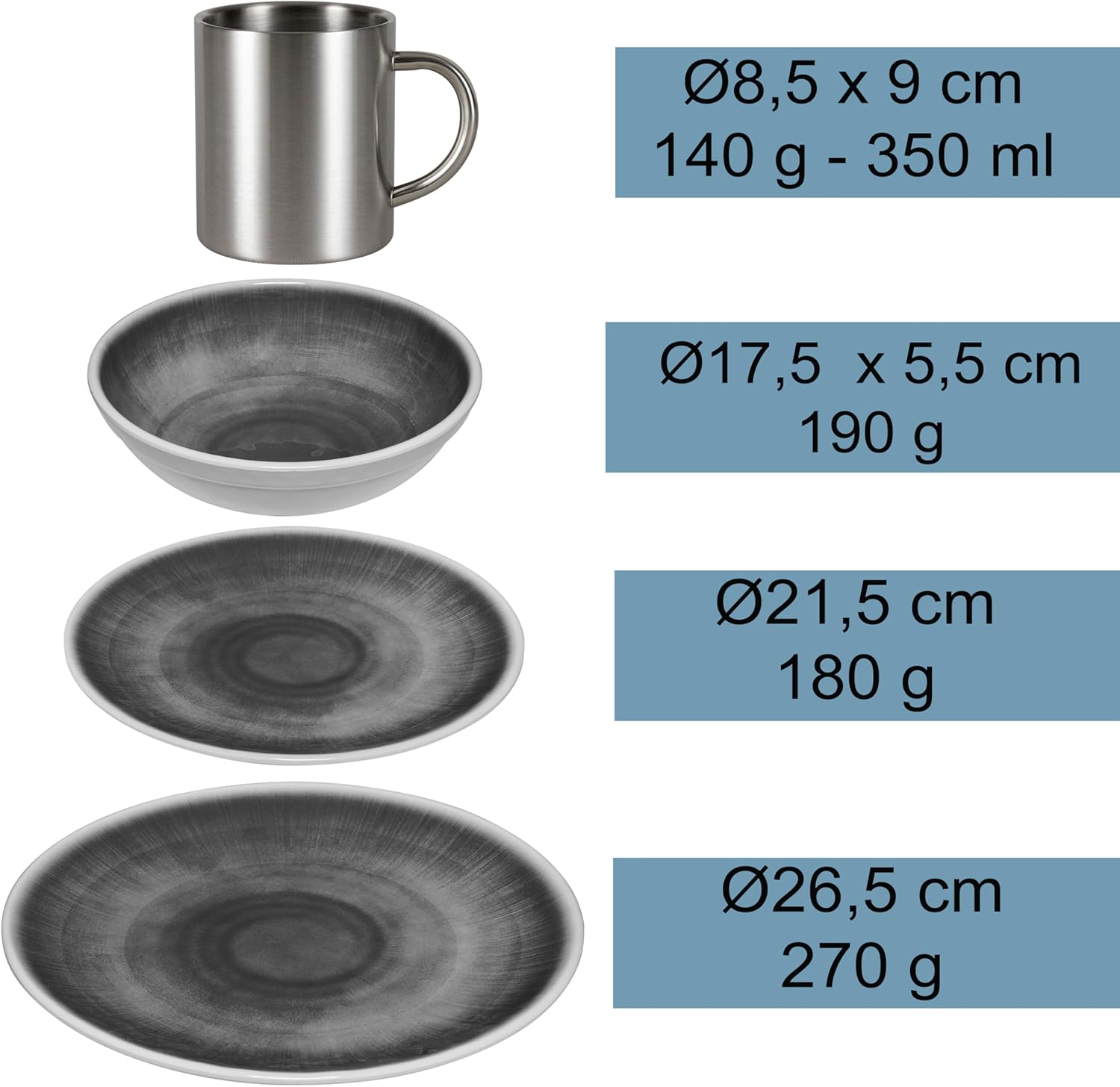 - ✅ PERFEKTE KOMBINATION VON MELAMIN UND EDELSTAHL: Melamin ist leicht, stabil und praktisch – ideal fürs Camping. Allerdings ist es nur bis 70 °C hitzebeständig und daher nicht für sehr heisse Getränke wie frisch aufgebrühten Tee geeignet.