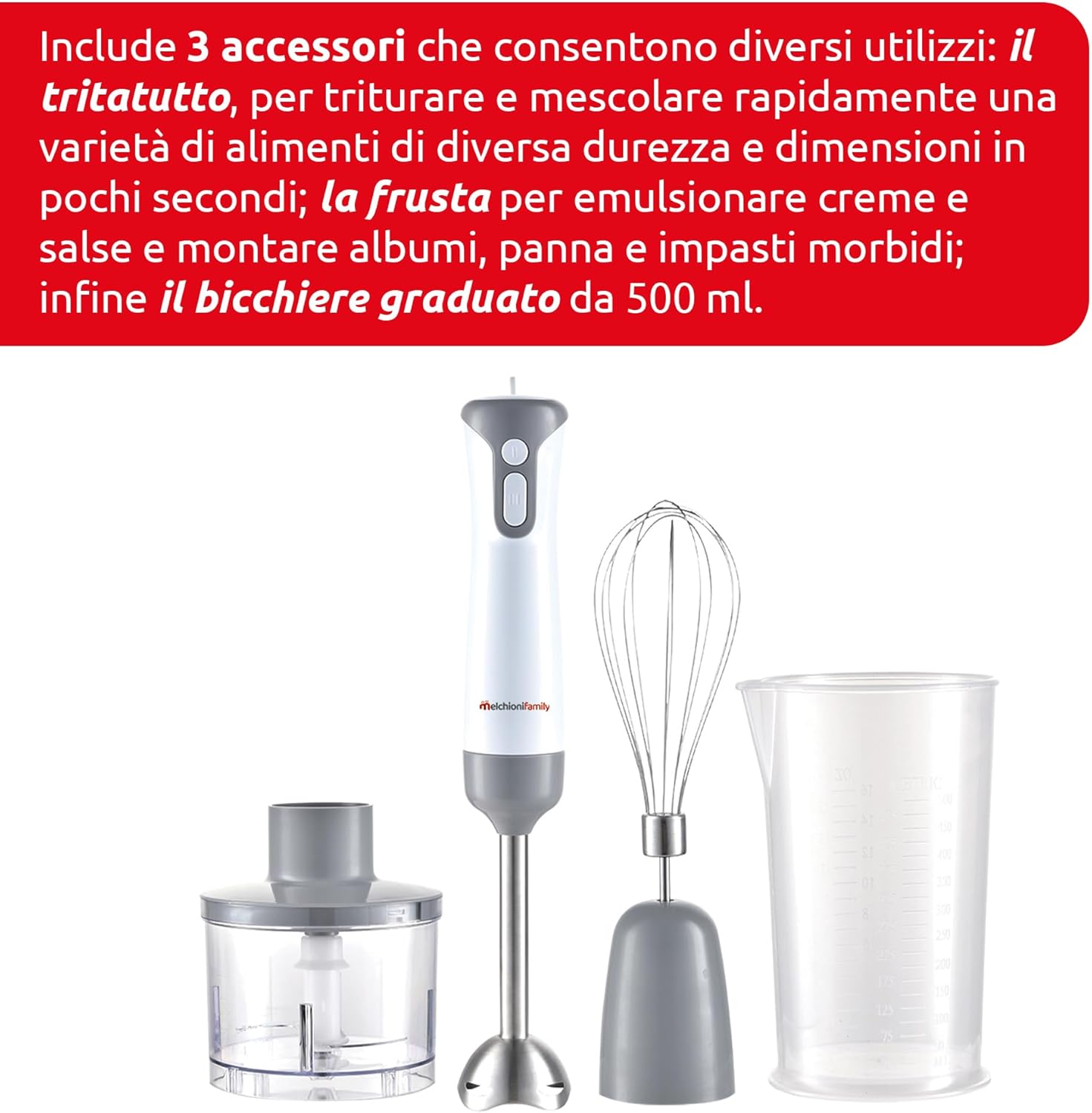 - Der Melchioni Family MIXXXO TRIO Stabmixer ist ideal für alle Ihre Bedürfnisse in der Küche, dank seines Zubehörs ist er ein wertvolles Hilfsmittel für alle Ihre Zubereitungen: Mixen, Hacken, Hacken, Schlagen und vieles mehr