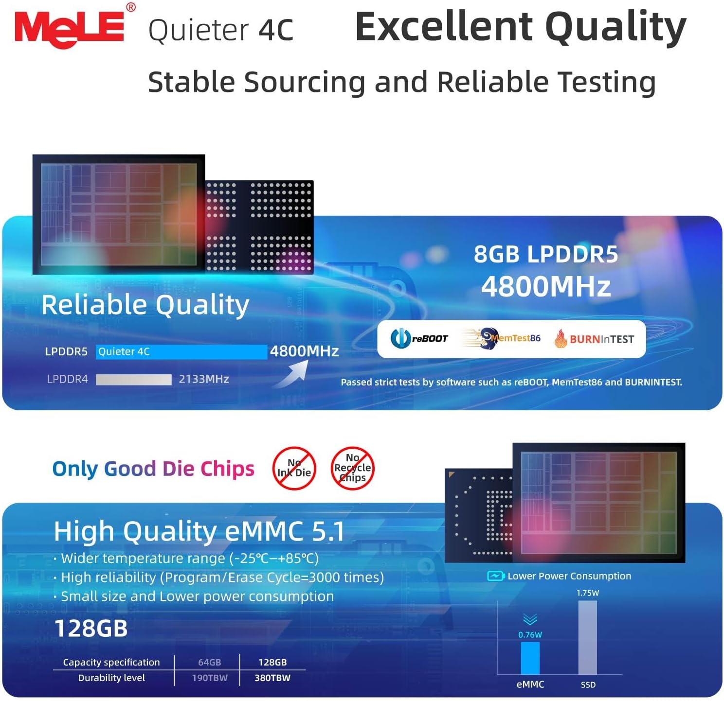- Leistung der nächsten Generation -- Der MeLE Quieter 4C N150 verfügt über die neueste Twin Lake N150 CPU, 4 Kerne, 4 Threads und 6 MB Cache mit einer Spitzengeschwindigkeit von 3,6 GHz. Eine Leistungsverbesserung von 6 % – 10 % gegenüber der Alder