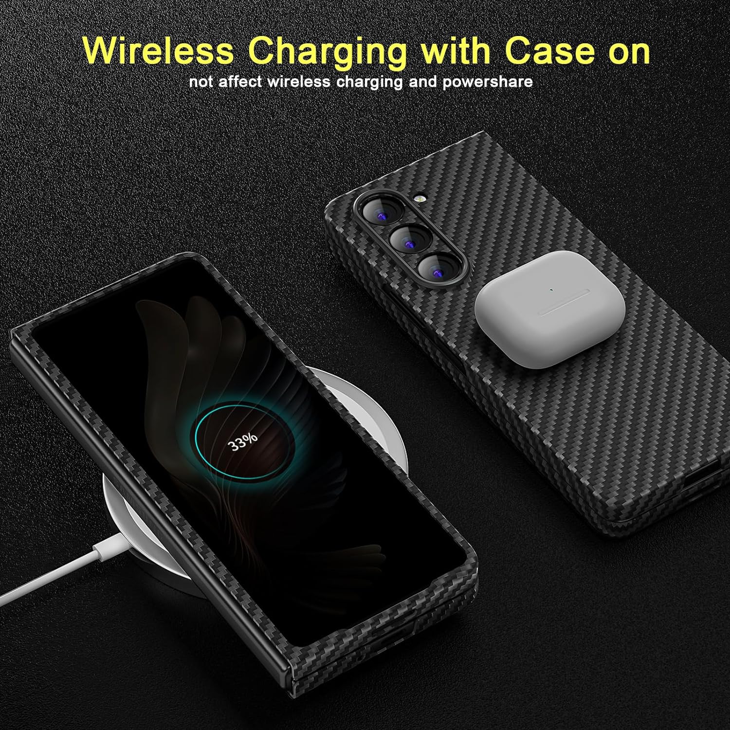 - [Funktioniert mit Kabellosem Laden]: Unterstützt kabelloses Laden, ohne diese Galaxy Z fold 5 Kohlefaserhülle zu entfernen, und unterstützt magnetisches Laden.