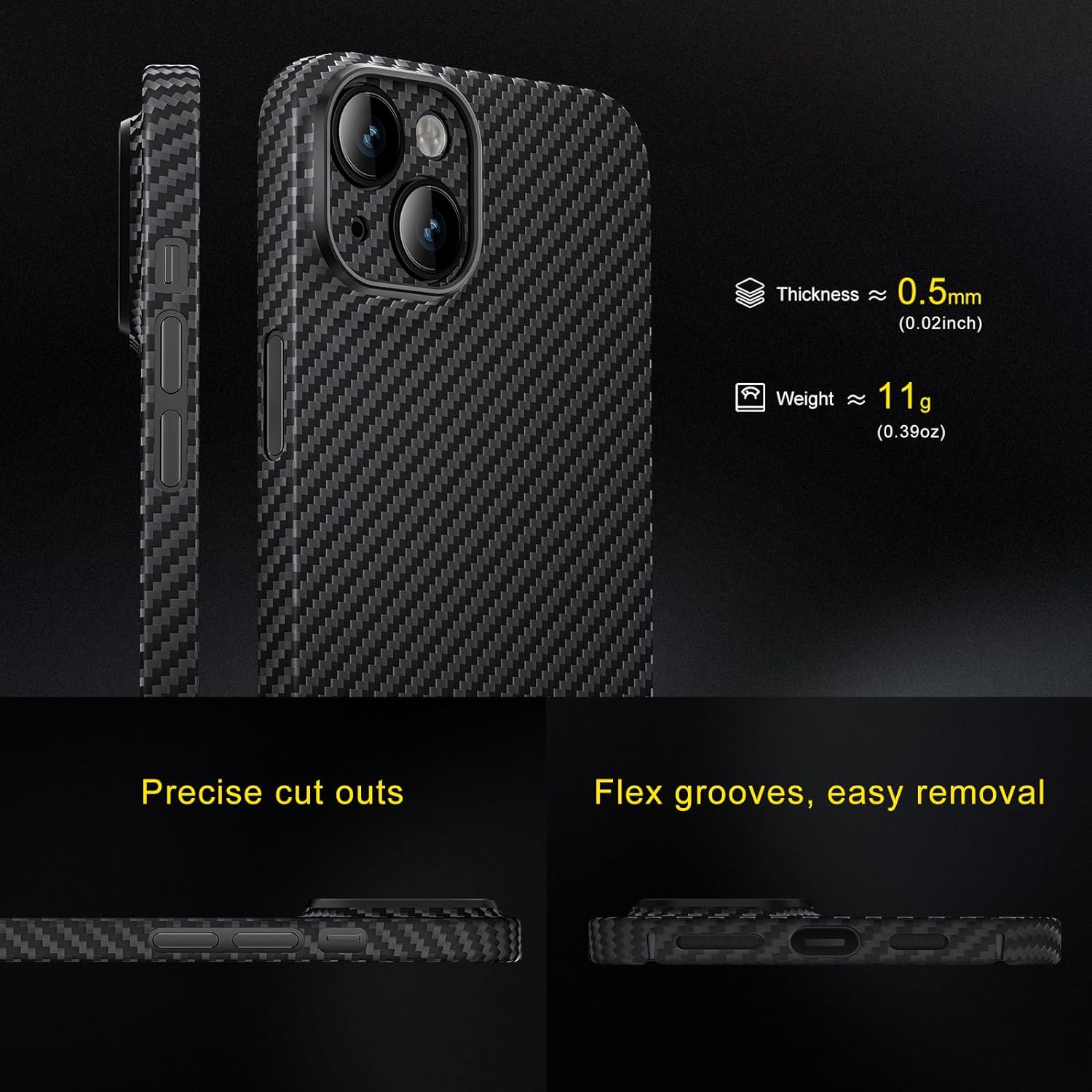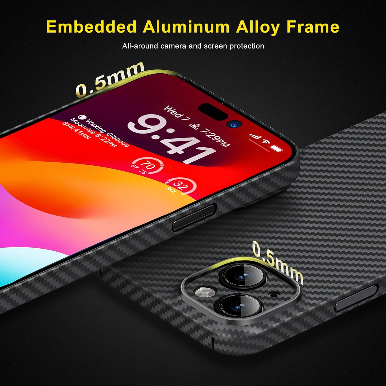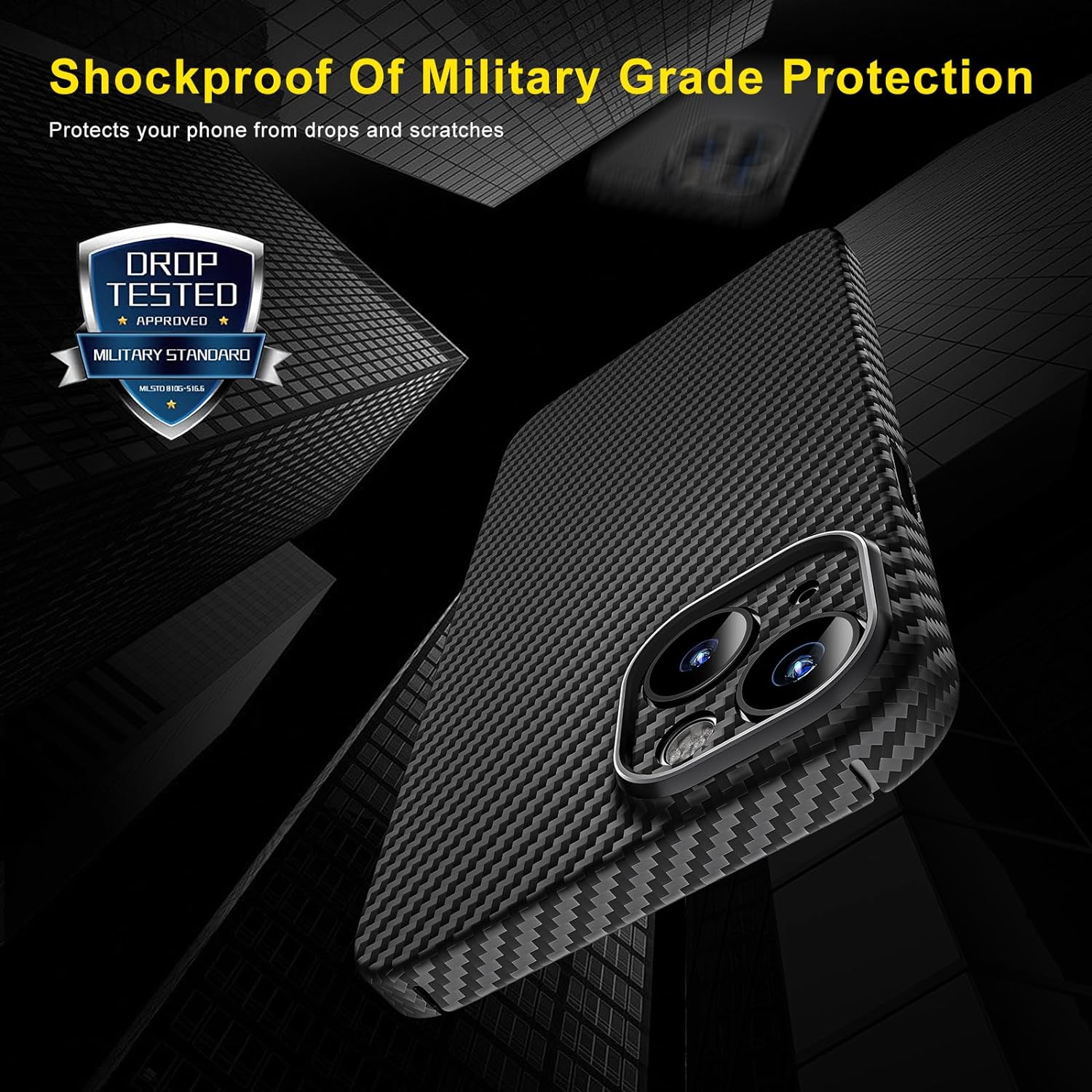 - [Echte Karbonfaser]: Die ultra dünn carbon Hülle für iP 15 besteht aus 100 % Aramidfaser from Dupont, die aufgrund ihrer Hitzebeständigkeit, Reibungsbeständigkeit und Korrosionsbeständigkeit im Allgemeinen in Flugzeugen und beim Militär verwendet