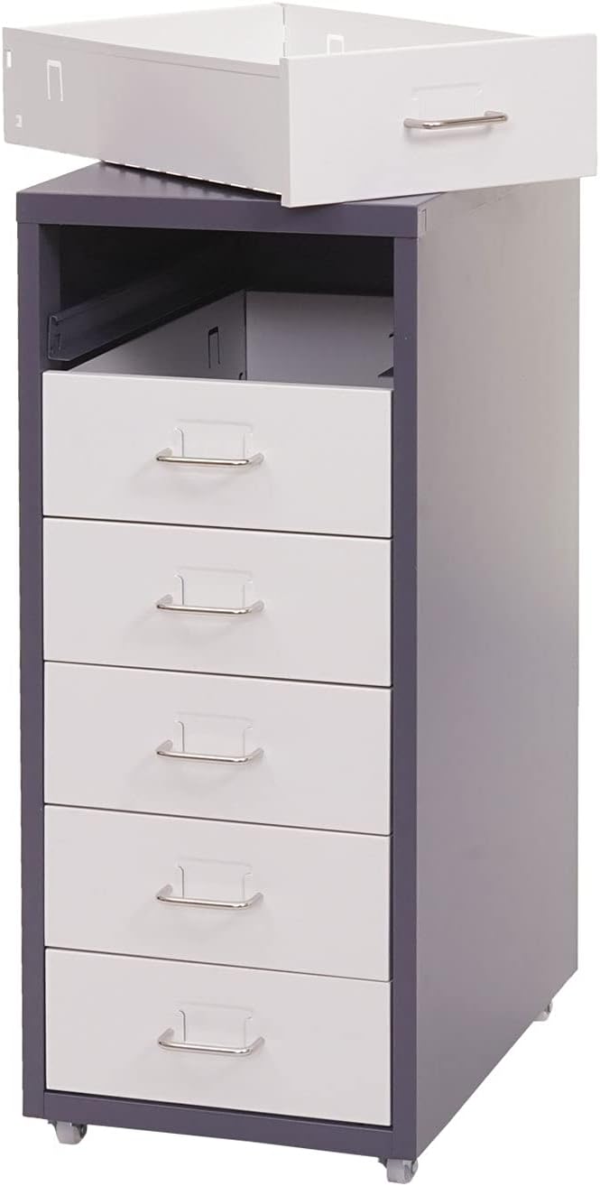 • Dimensionen (HxLxB): 69x41x28cm | Material: Pulverbeschichtetes Stahlblech | Farbe: Korpus: dunkelgrau - Schubladen: weiss - Haltegriffe: chromfarben - Laufrollen: weiss