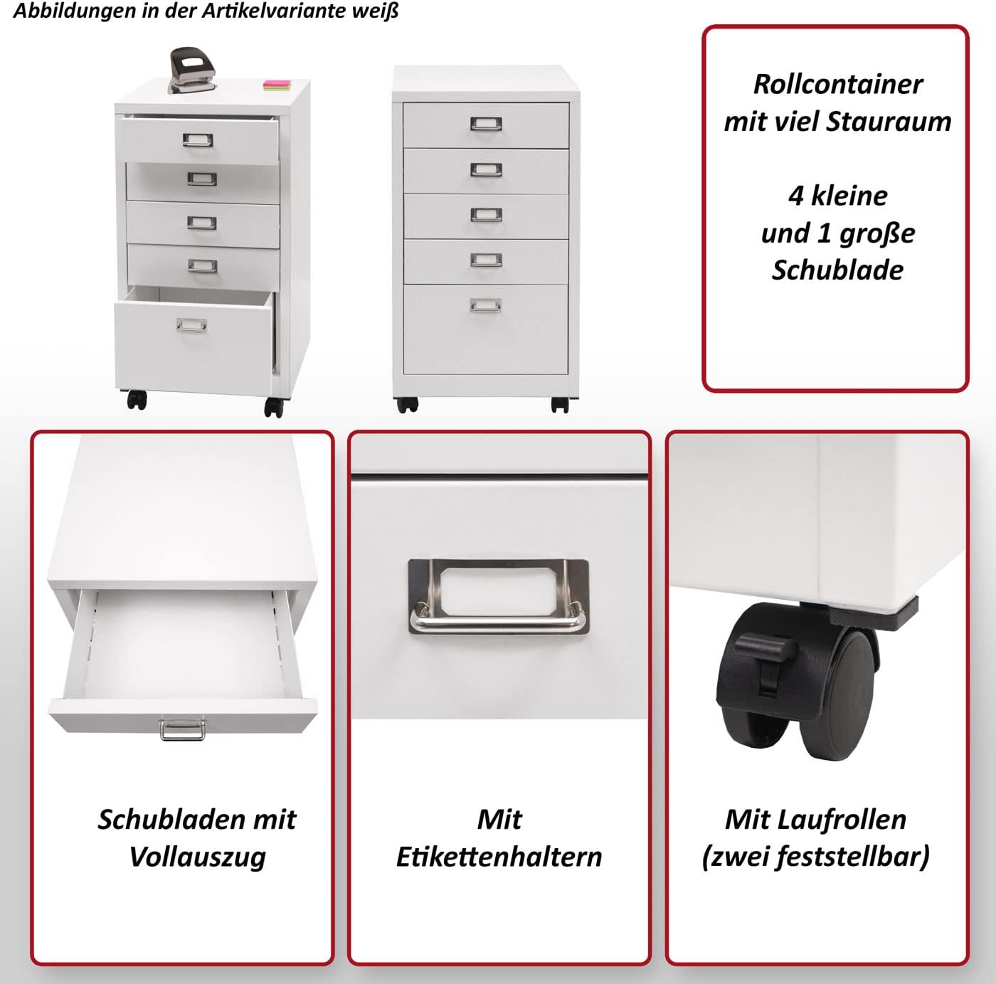 - Dieser schlichte Bürocontainer darf in Ihrem Arbeitszimmer nicht fehlen. Die fünf Schubladen aus Stahl bieten ausreichend Platz für beispielsweise Büroutensilien, Computerzubehör und Dokumente, die nichts auf Ihrem Schreibtisch zu suchen haben.