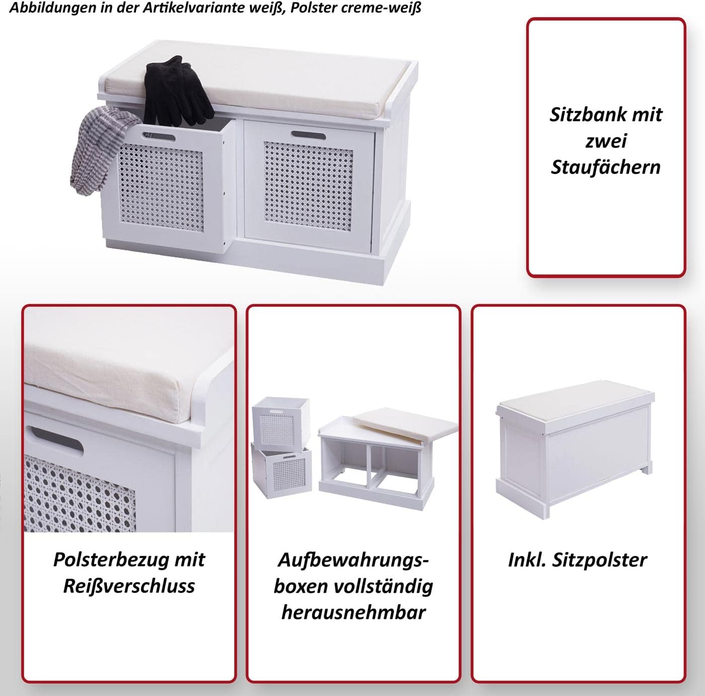 - Diese Sitz-Kommode überzeugt nicht nur durch ihr schlichtes Design. Dank den zwei praktischen Aufbewahrungsboxen verfügt sie über reichlich Unterbringungsmöglichkeiten für Ihre alltäglichen Gebrauchsgegenstände wie Taschen, Regenschirme oder