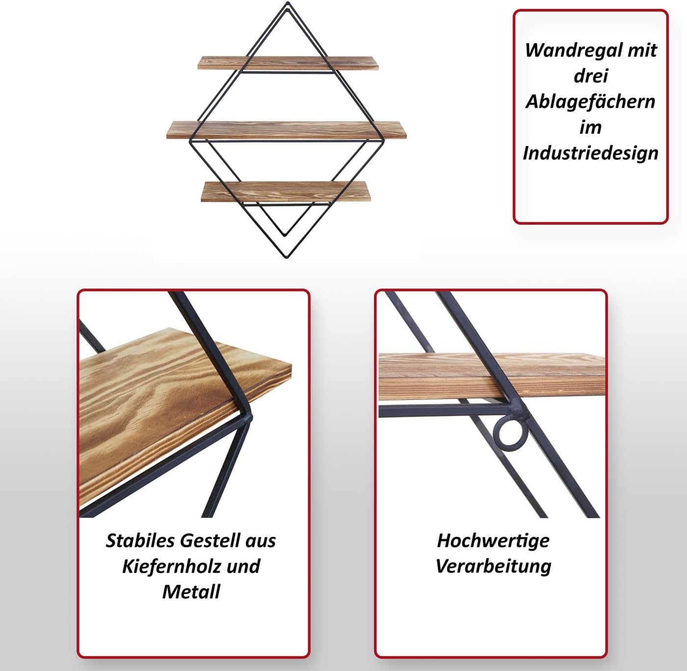 - Lieferumfang: 1x Wandregal | Lieferung erfolgt ohne Dekoration | Komplett fertig montiert | BSCI-Sozialstandards geprüft | Industriedesign | 3 Ablagefächer | Material: Kiefernholz und Metall | Befestigungsmaterial nicht im Lieferumfang enthalten
