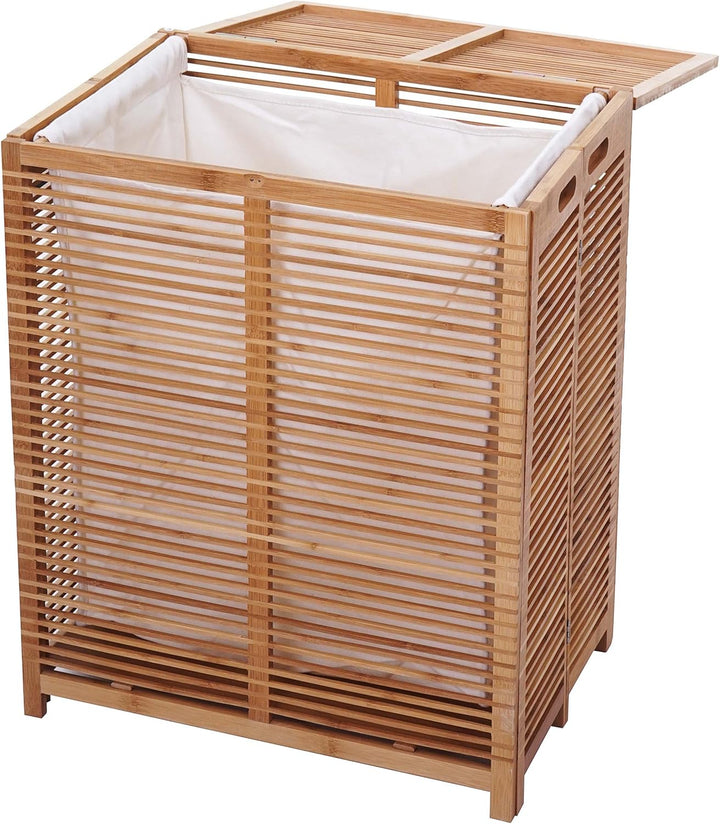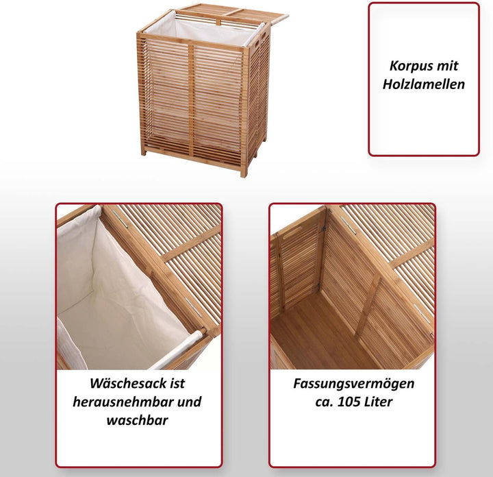 - Lieferumfang: 1x Wäschetruhe | Material Truhe: Bambus | Material Sack: 80% Polyester, 20% Baumwolle | Wäschesack ist herausnehmbar und waschbar | Korpus mit Holzlamellen | Fassungsvermögen ca. 105 Liter