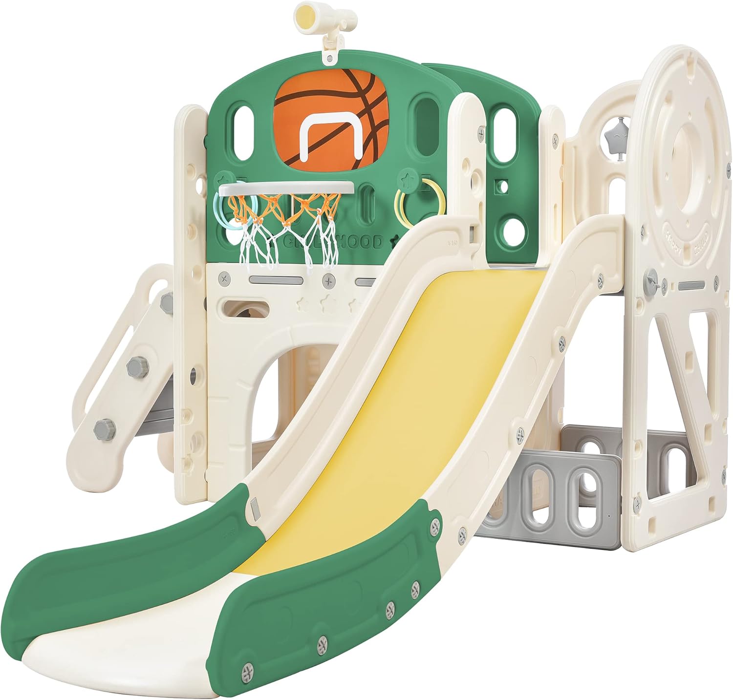 Merax Rutsche für Kinder, 6 in 1 Kinderrutsche mit Basketballrahmen, Klettern, Stauraum, Tunnel, Kin