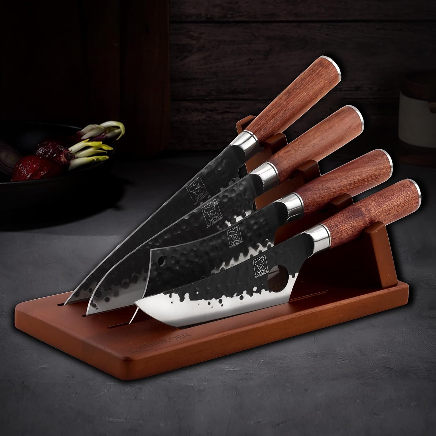 • ✔【Professionelles Küchenmesser-Set】HOAB-08 enthält einen horizontal platzierten Messerblock aus Akazienholz mit 4 hochspezifischen Küchenmessern, alles in einer wunderschön präsentierten Box. HOAB-08 ist ein professionelles Küchenmesser-Set.