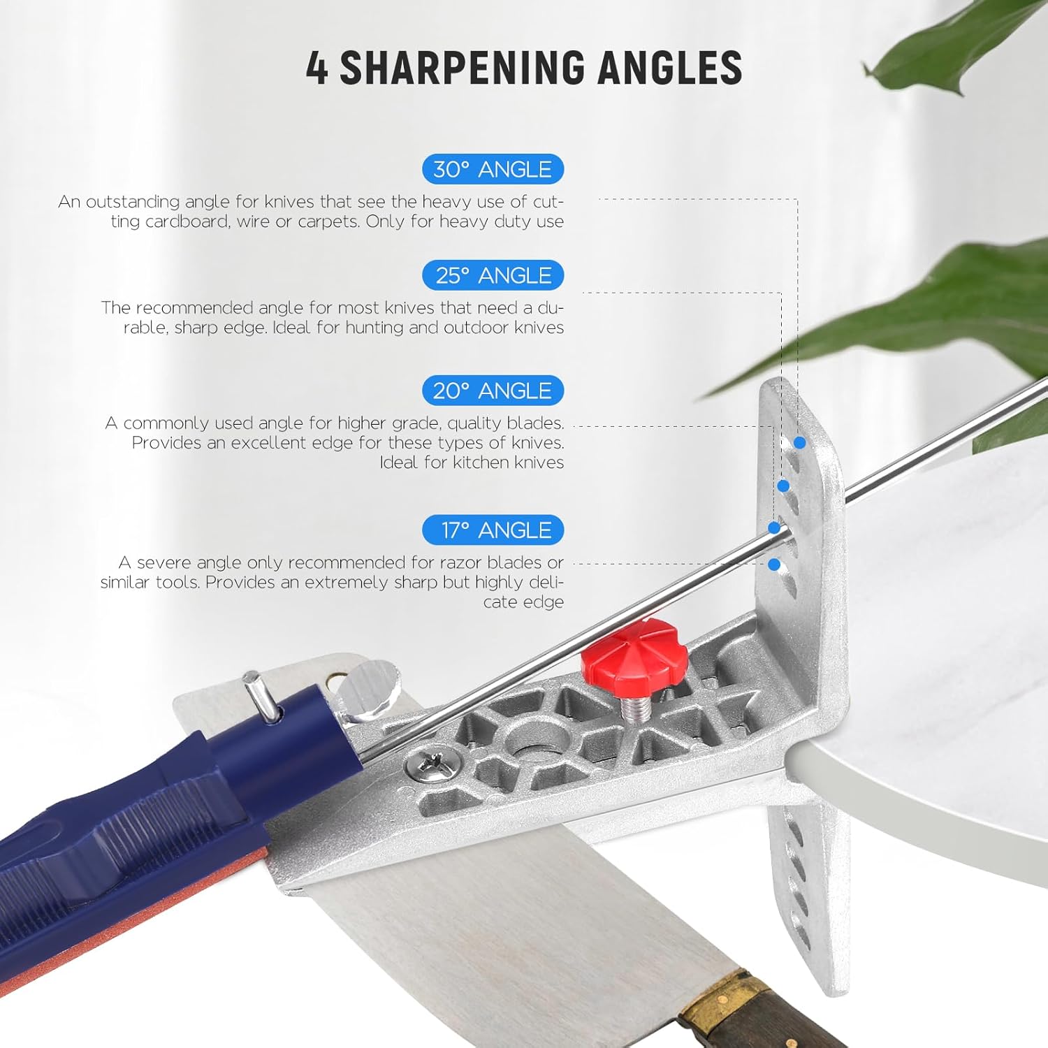 - Einstellbare Schärfwinkel: Mit vier verfügbaren Schärfwinkeln bietet dieses Kit eine Reihe von Bedienmöglichkeiten, die Präzision und Flexibilität bei der Aufrechterhaltung der perfekten Kante Ihrer Messer gewährleisten.