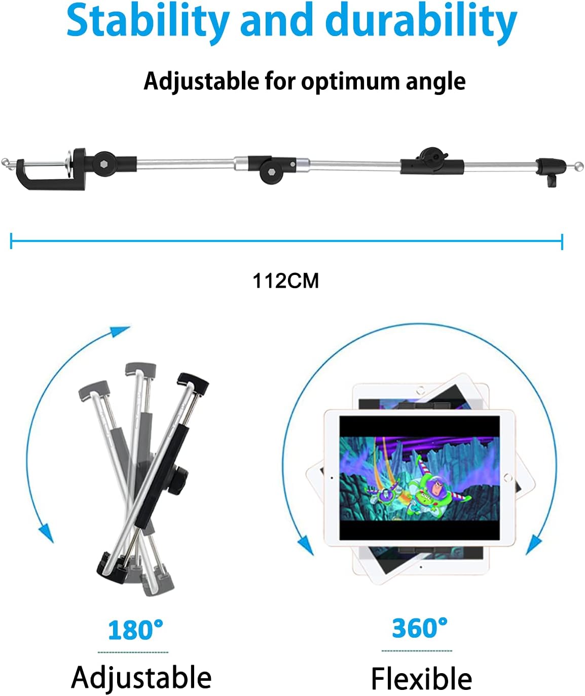 - 【Alle Winkeleinstellung】Das innovativste Design der Aluminium-Tabletklemme mit langem Arm besteht darin, dass jede Halterungsstange flexibel eingestellt werden kann, um eine horizontale oder vertikale 360-Grad-Drehung und eine 180-Grad-Biegung zu erreichen, um jeden Winkel und jede gewünschte Position zu erreichen. Maximale Höhe 112 cm.
