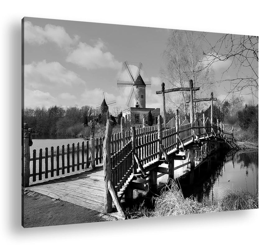 deyoli Mühlenwerke am sonnigen See Format: 80x60 als Leinwand, Effekt: Schwarz&Weiss, Motiv fertig g