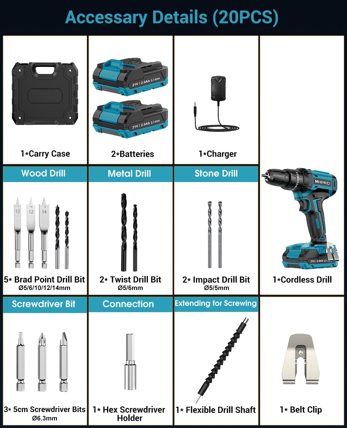 - 【Hochwertige Materialien & Umfangreiches Zubehör】Die verbesserte Schlagbohrmaschine von MHPRO besteht aus hochwertigen Materialien und wird geliefert mit: Akku Bohrer *1, 2.0Ah Akku *2, Ladegerät *1, Tragetasche *1, Benutzerhandbuch *1, Holzbohrer
