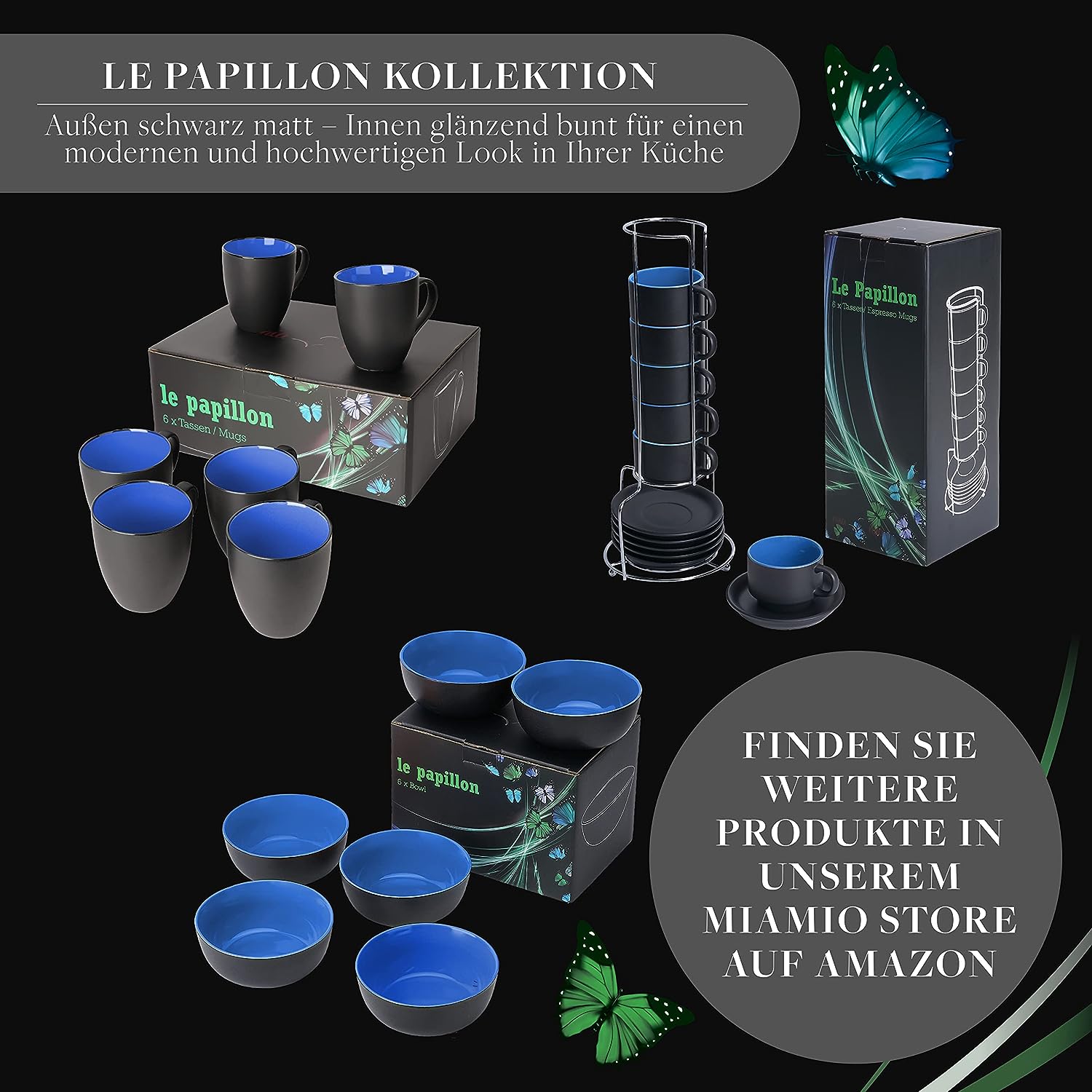 - 𝟔 𝐓𝐄𝐈𝐋𝐈𝐆 – Das farbige Set besteht aus 6 schwarzen Tassen, welche jeweils 350ml Volumen haben. Unsere Kaffee Becher der Serie „Le Papillon“ sind erhältlich in Blau, Rot und Grün, Schwarz sowie als Kombi in 6 verschiedenen