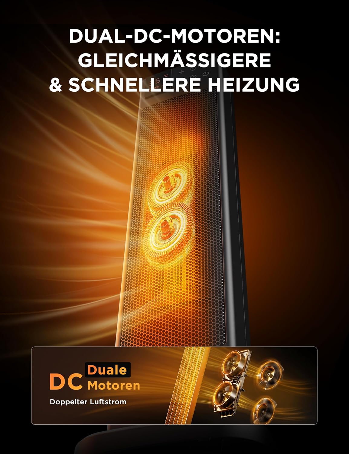 - Augenblicklich, konstantes Wärmegefühl: In nur 2 Sekunden spürt man die bis zu 35°C Wärme, dank eines leistungsstarken Dual-DC-Motors und eines 120% grösseren PTC-Wärmeelementes – für schnellere, effizientere Wärme. Der 23-Zoll-Wärmeschild in