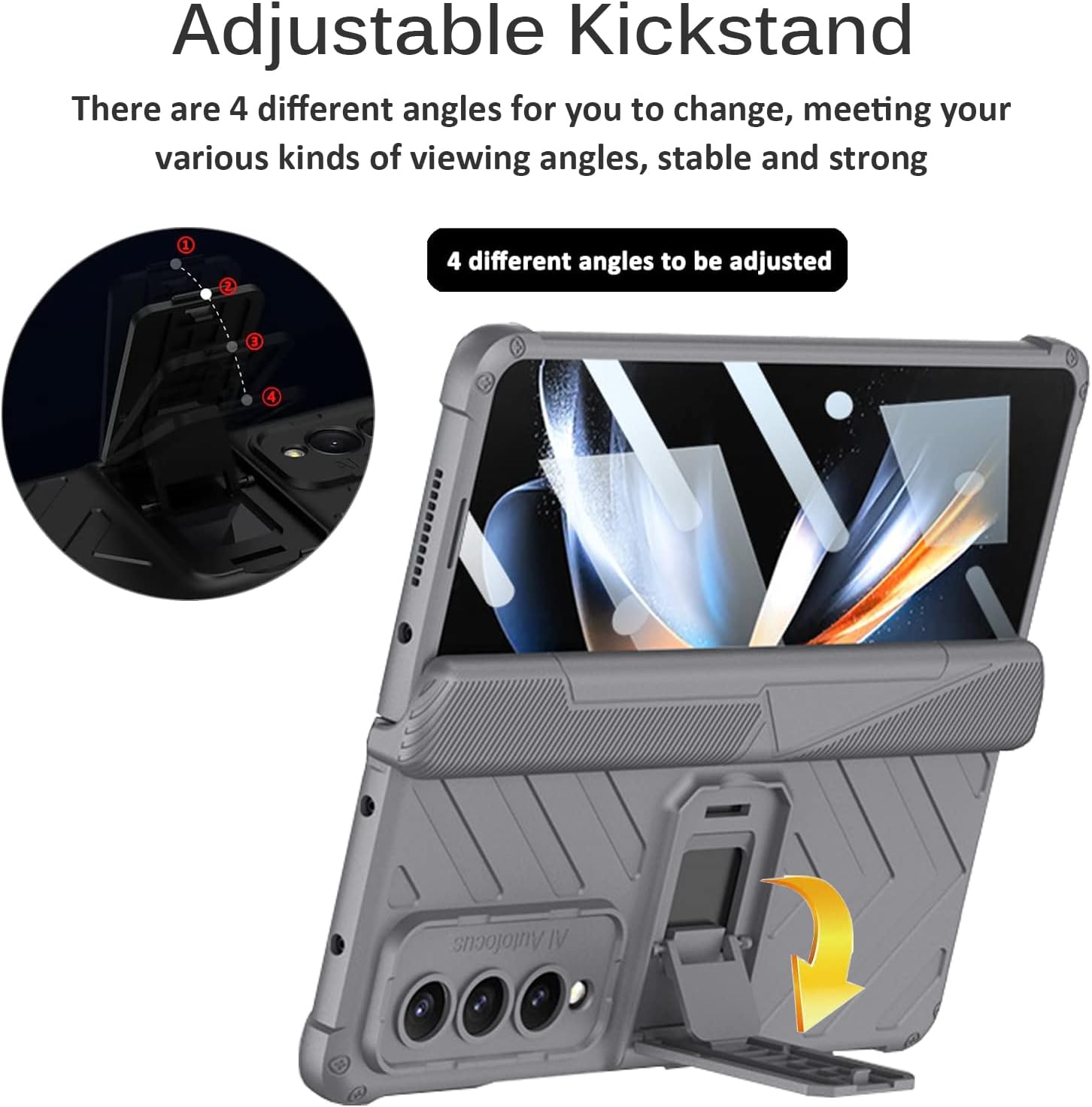 • [Einstellbarer Ständer] Diese Galaxy Z Fold 4 Hülle verfügt über eine Standfunktion, die vier einstellbare Winkel hat, den besten Winkel für Sie auswählt, und der Ständer im Querformat ist praktisch zum Ansehen von Filmen oder Video-Chats, sodass