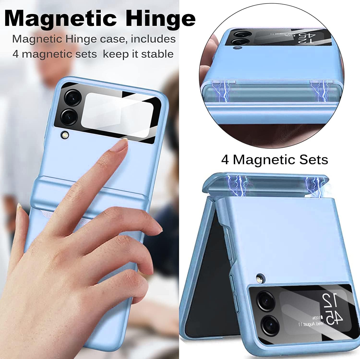 - [Magnetischer Scharnierschutz] Die Galaxy Z Flip 4 5g Hülle bietet Scharnierschutz mit vier eingebauten Magneten, die sich gegenseitig anziehen, um sicherzustellen, dass das Scharnier fest geschlossen ist. Das Scharnier lässt sich flexibel einklappen.