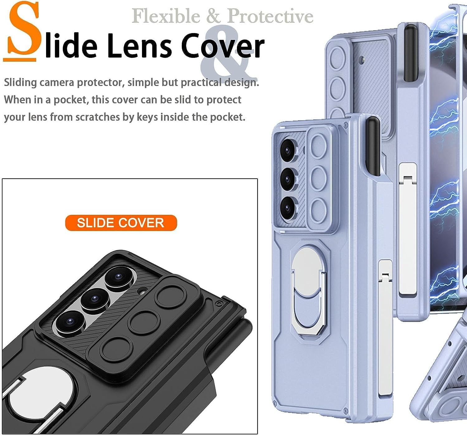 - [Schieben Kamera Abdeckung] Die Samsung Z Fold 5 Handyhülle mit Ständer ist zwei Millimeter höher als die Handylinse, die die Linse schützen kann. Das Foliendesign macht es bequem, Ihre Telefon Kamera zu verwenden.