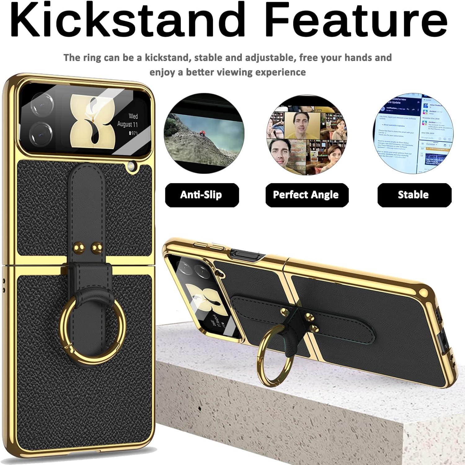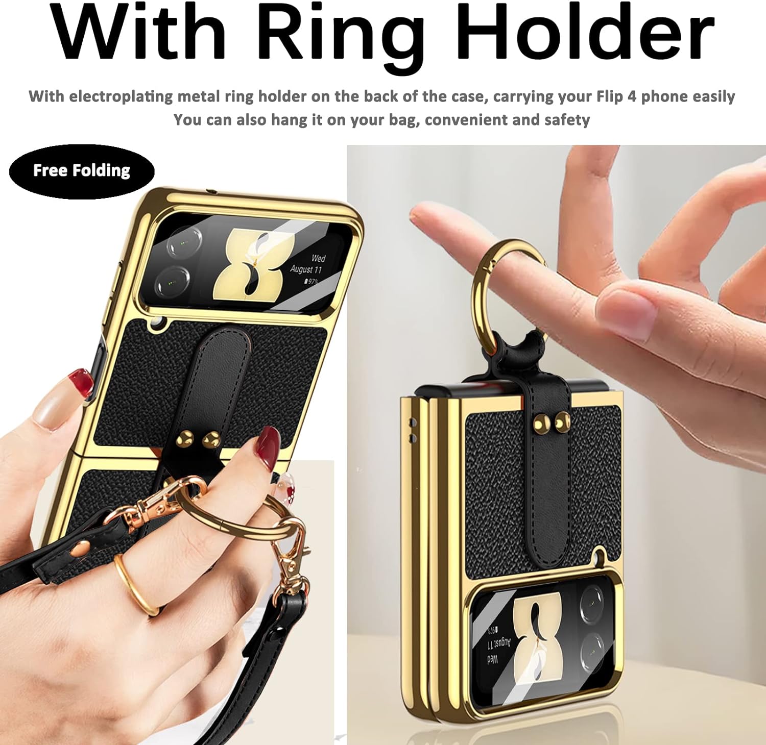 - [Premium Material] Die Rückseite der Z Flip 4 Hülle mit Ring besteht aus PU Leder material, das bequem und leicht zu greifen ist; Die Seite besteht aus hartem PC Material, ist stossfest und sturzfest. Hochwertiges Galvanisierungsverfahren bietet ein