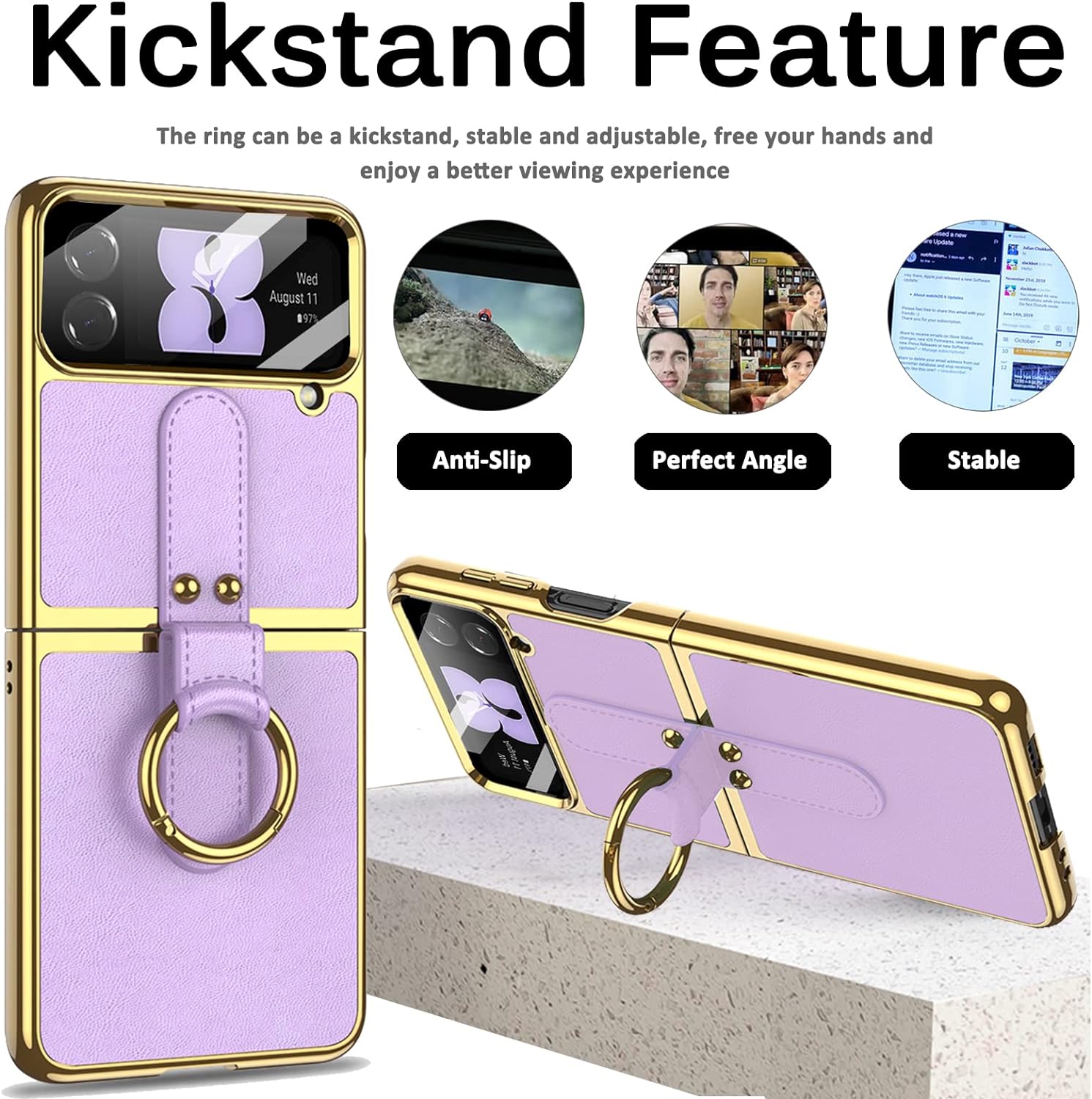• [Premium Material] Die Rückseite der Z Flip 4 Hülle mit Ring besteht aus PU Leder material, das bequem und leicht zu greifen ist; Die Seite besteht aus hartem PC Material, ist stossfest und sturzfest. Hochwertiges Galvanisierungsverfahren bietet ein