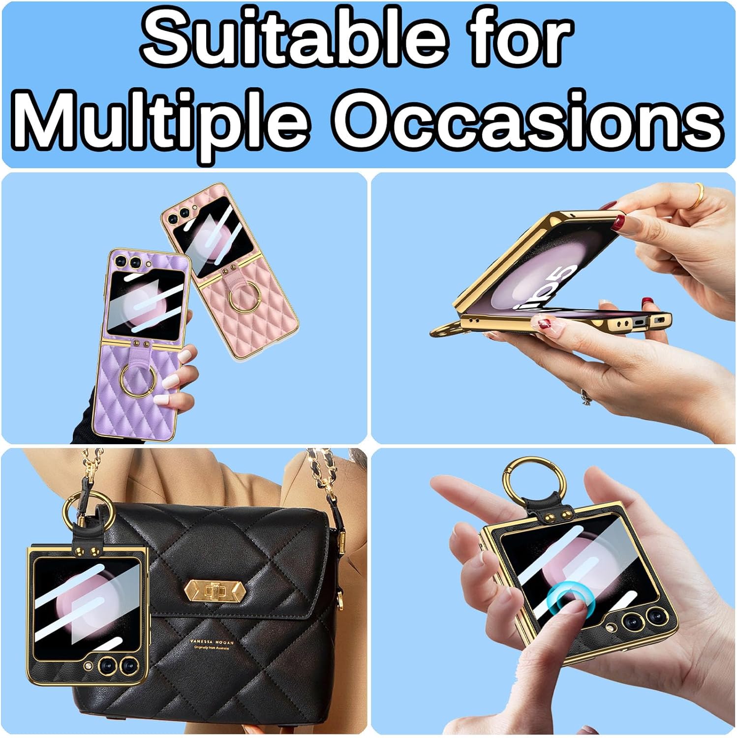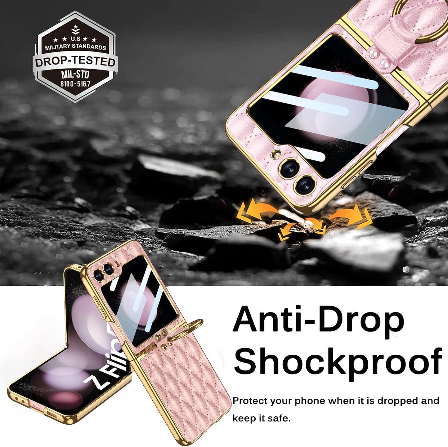- 👍[Premium Material] Die Rückseite der Z Flip 5 Handyhülle besteht aus PU Leder material, das bequem und leicht zu greifen ist; Die Seite besteht aus hartem PC Material, ist stossfest und sturzfest. Hochwertiges Galvanisierungsverfahren bietet ein