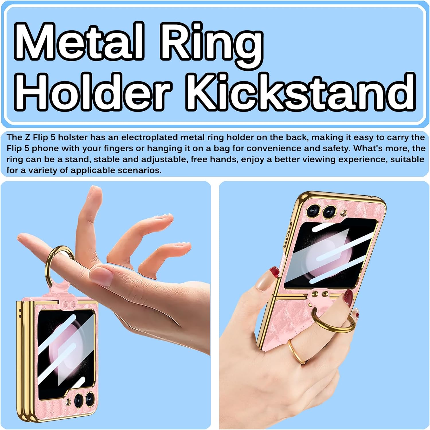 - 💖[Ring Ständer] Diese Galaxy Flip 5 Hülle mit Kameraschutz wird mit einem Ring Karabiner geliefert. Der glänzende Metal Karabiner kann an den Fingern oder der Tasche aufgehängt werden, Sehr bequem, Ihr Telefon beim Ausgehen zu tragen. Dieser Ring