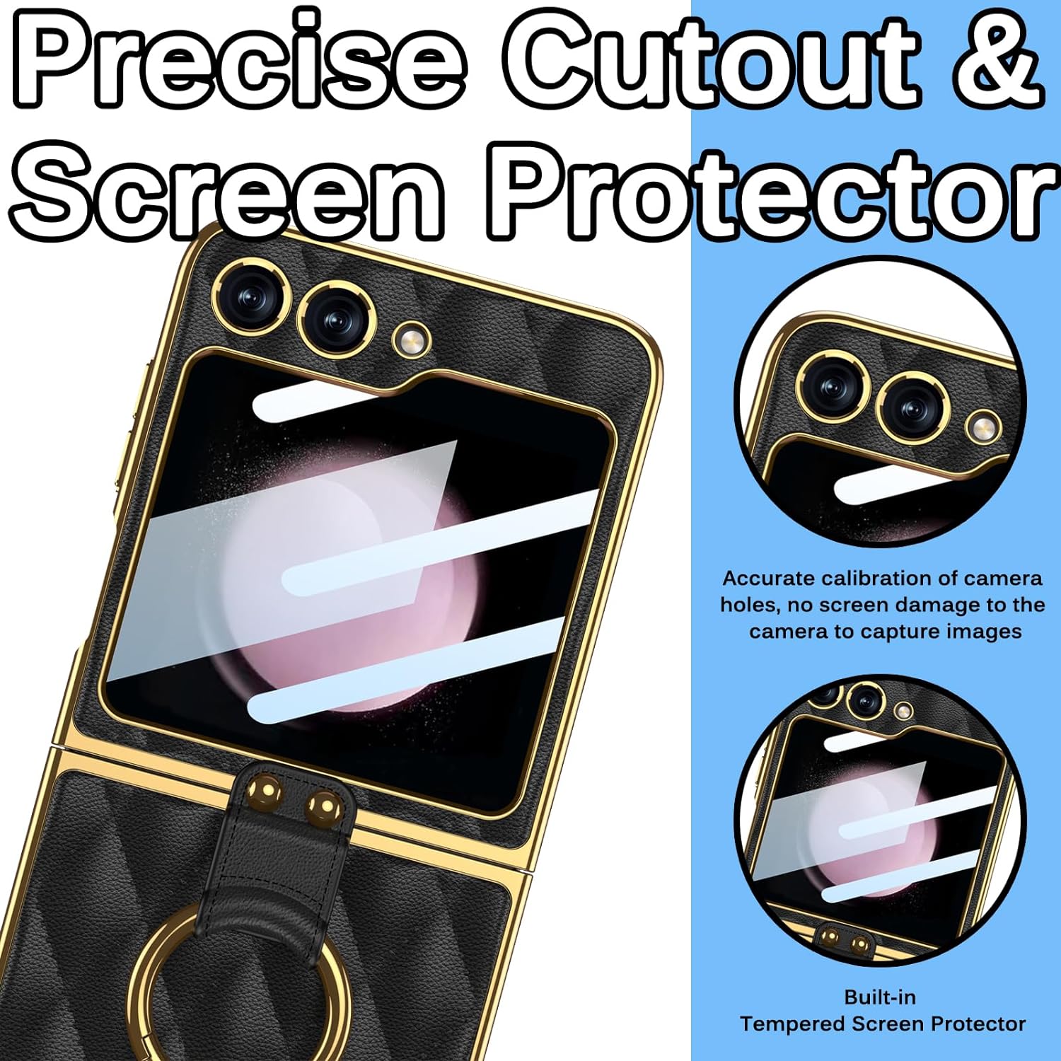 • 👍[Premium Material] Die Rückseite der Z Flip 5 Handyhülle besteht aus PU Leder material, das bequem und leicht zu greifen ist; Die Seite besteht aus hartem PC Material, ist stossfest und sturzfest. Hochwertiges Galvanisierungsverfahren bietet ein