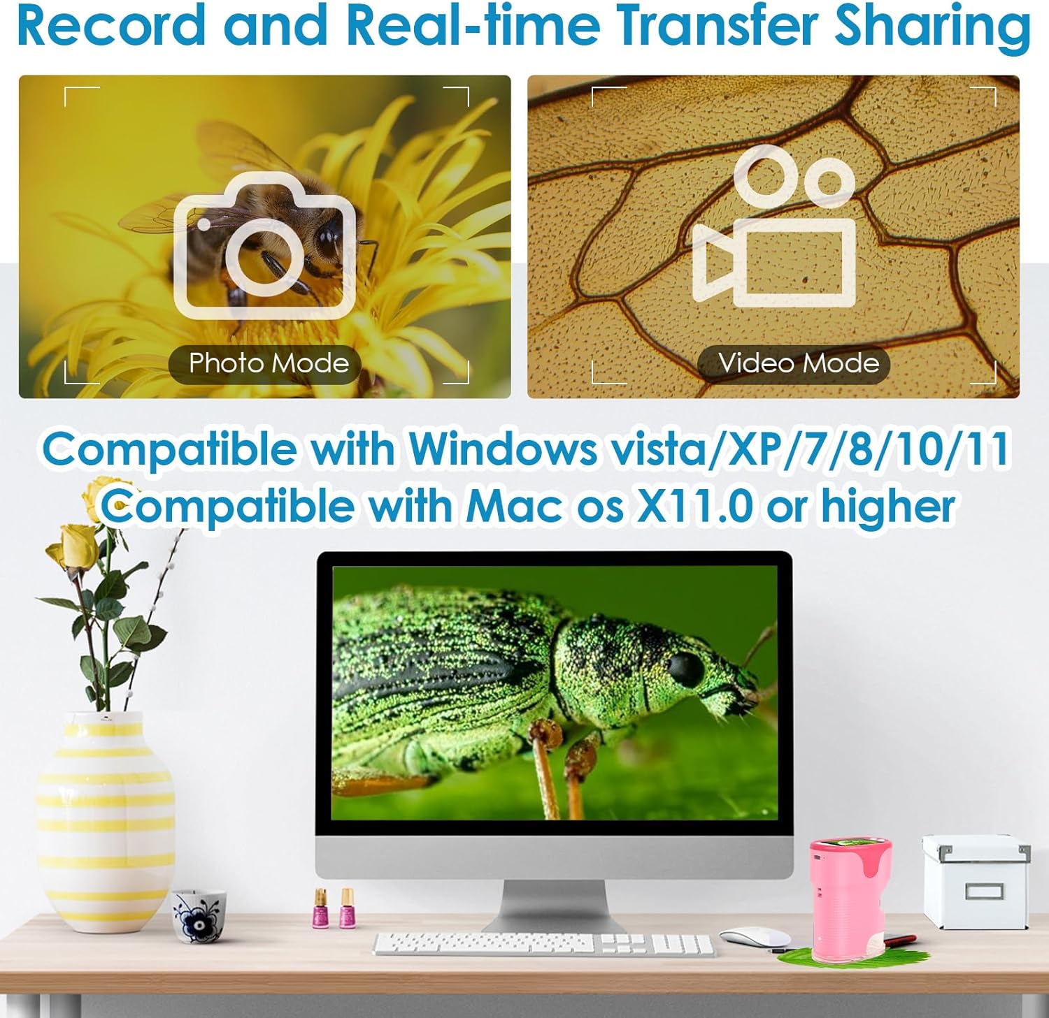 • 5X Zoom & 200–1000X Vergrösserung: Das Digitales Mikroskop bietet eine stufenlose Vergrösserung von 200- bis 1000-fach. Dieses Kinder Mikroskop ist perfekt für die detaillierte Beobachtung von Pflanzenblättern, Insektenflügeln, Sandkörnern und