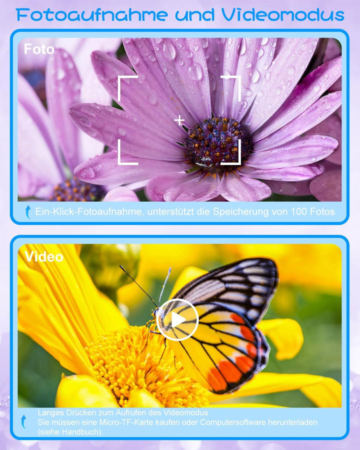 - Foto und Videomodus: Das Besondere an diesem Mikroskop für Kinder ist die Möglichkeit, Fotos in Echtzeit und ohne Verzögerung zu machen. Sie können etwa 100 Bilder aufnehmen und lokal speichern. Durch langes Drücken der Kamerataste können Sie