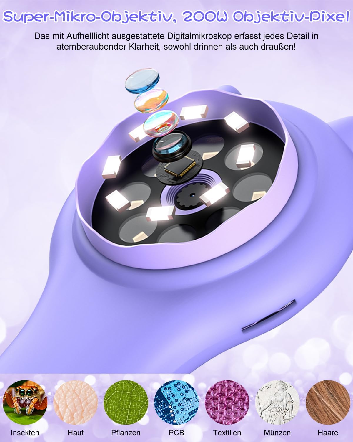 - Hochwertige Betrachtung:Das Mikroskop mit 2ZollIPSFarbbildschirm und 2MPMakroobjektiv bietet ein klares 1080pHDDisplay, mit dem Kinder Objekte mühelos betrachten können, ohne durch eine winzige Linse zu schauen. 8 LEDLeuchten, die das Mikroskop