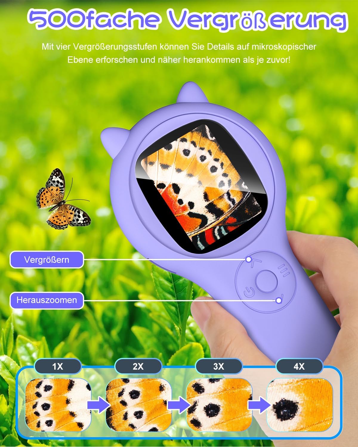 - 4x Zoom, 500X Vergrösserung: Das Handmikroskop mit bis zu 500facher Vergrösserung und bietet 4fachen Zoom. Mikroskop für Kinder zu detaillierten Beobachtungen auf Dinge wie Pflanzenblätter, Insektenflügel, Schmutz und Sand, und Sie können Fasern