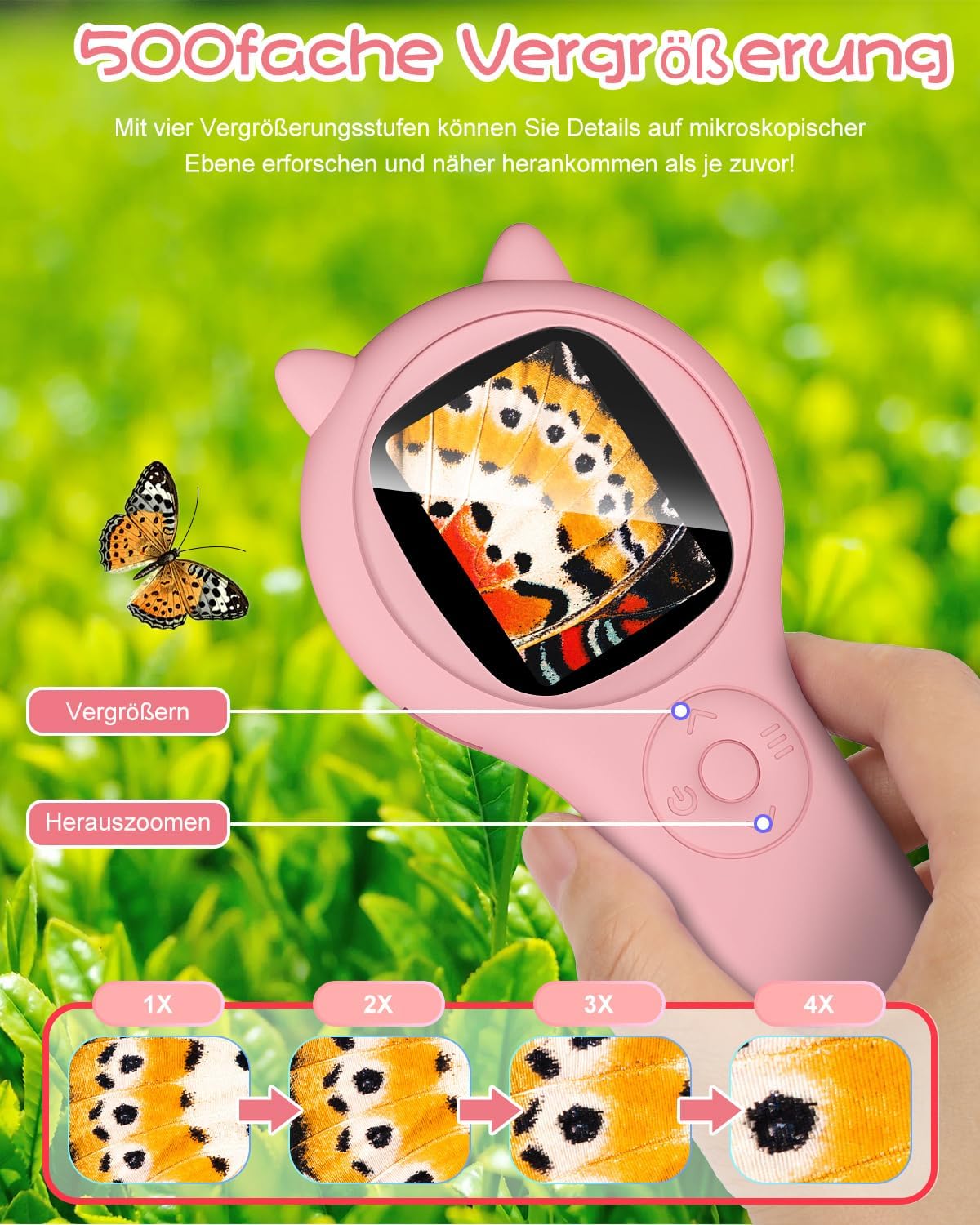 - 4x Zoom, 500X Vergrösserung: Das Handmikroskop mit bis zu 500facher Vergrösserung und bietet 4fachen Zoom. Mikroskop für Kinder zu detaillierten Beobachtungen auf Dinge wie Pflanzenblätter, Insektenflügel, Schmutz und Sand, und Sie können Fasern
