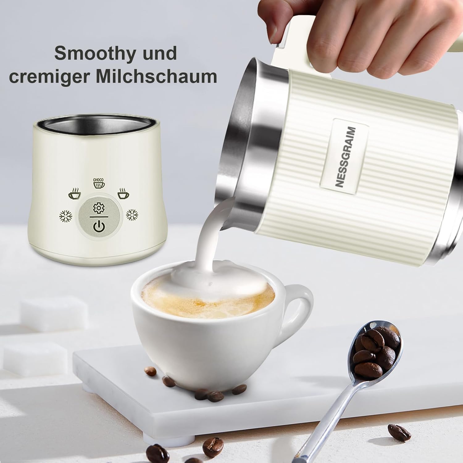 • 🍦【5-in-1 Milchaufschäumer für perfekten Genuss】- Entdecken Sie den vielseitigen Milchaufschäumer mit 5 präzisen Funktionen: cremiger Vollschaum, leichter Luftschaum, kalter Milchschaum, erhitzte Milch und köstliche heisse Schokolade. Mit