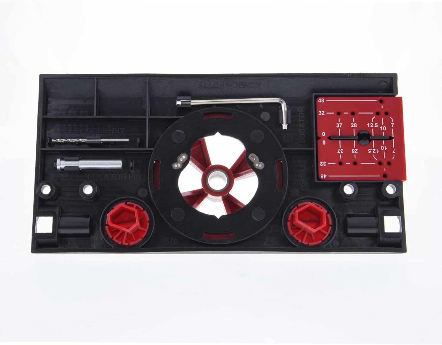 - Führungsbuchsen, die in den Körper der Vorrichtung eingebaut sind, ermöglichen das Vorbohren von Pilotlöchern an 4 gängigen Stellen, stellen Sie sicher, dass die Scharniere gerade sind und die Tür wahr schliesst. Der 1/16" Durchmesser Bohrer für