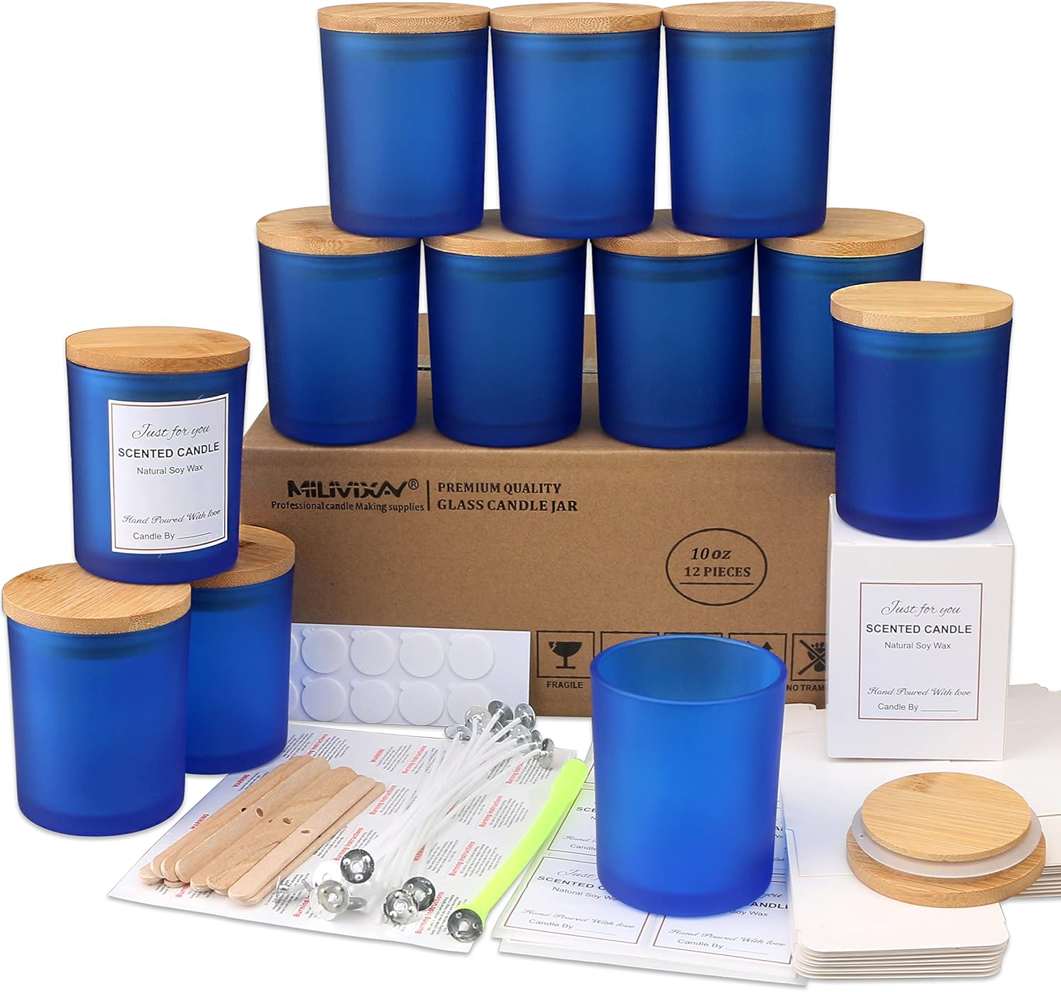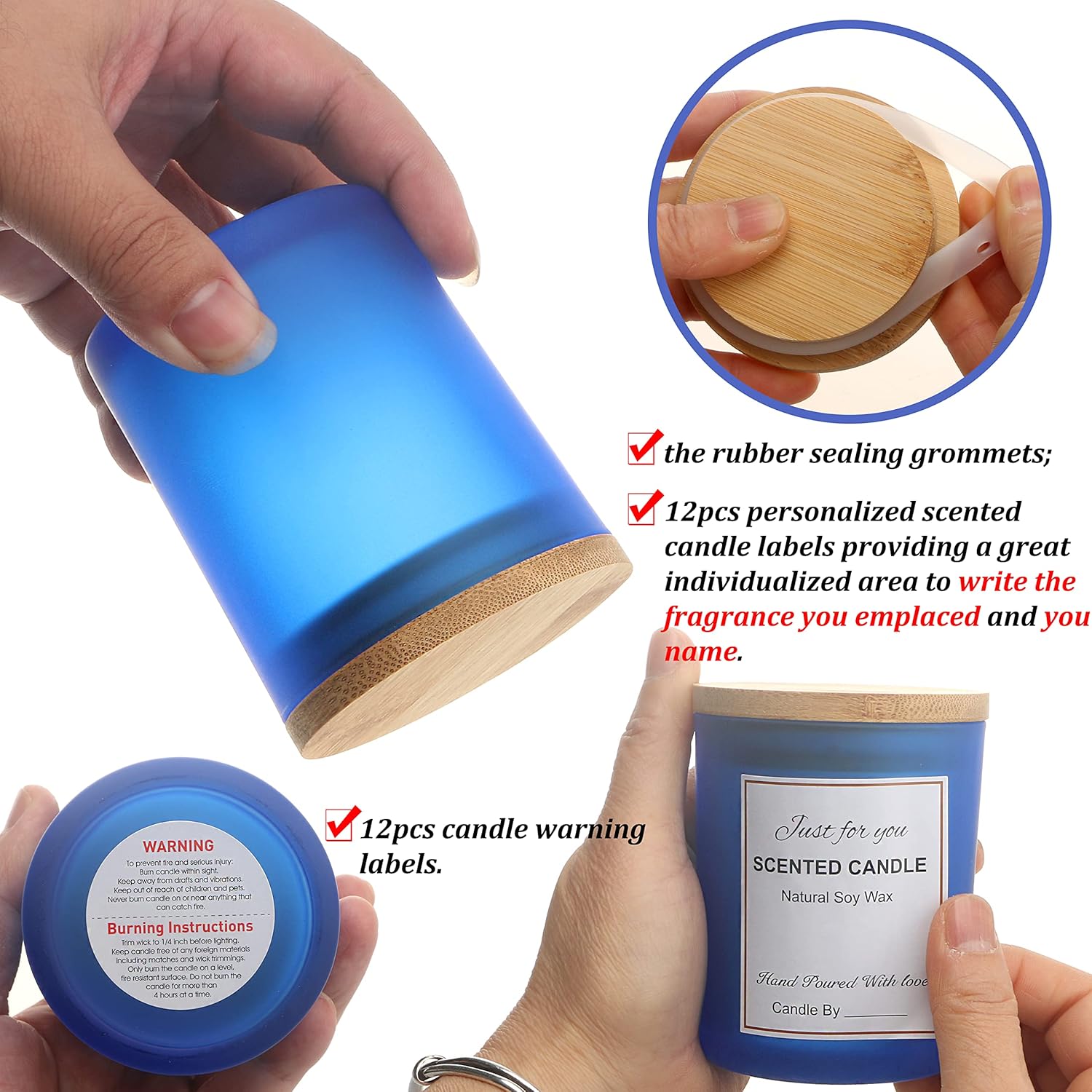 - ▶️ Kaufen Sie es und Sie erhalten: 12 Stück mattierte blaue Gläser mit luftdichten Bambusdeckeln, 20 Stück 15,2 cm Kerzendochte, 20 Stück Kerzendocht-Aufkleber, 20 Stück Dochthalter, 12 Stück Kerzen-Warn-Etiketten, 12 Stück