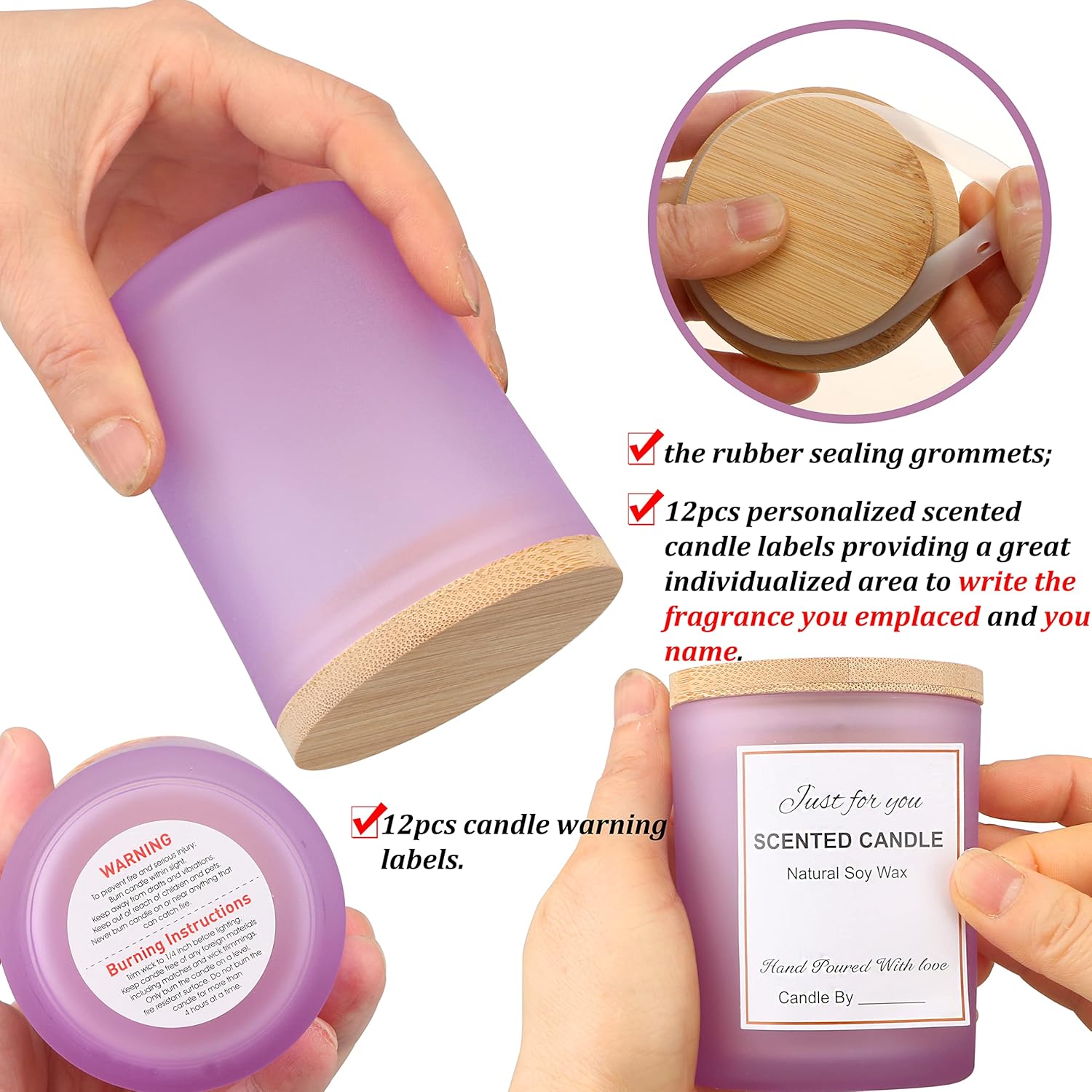- ▶️ Kaufen Sie es und Sie erhalten: 12 Stück mattviolette Gläser mit luftdichtem Bambusdeckel, 20 Stück 15,2 cm Kerzendochte, 20 Stück Kerzendochtaufkleber, 20 Stück Dochthalter, 12 Stück Kerzenwarnetiketten, 12 Stück