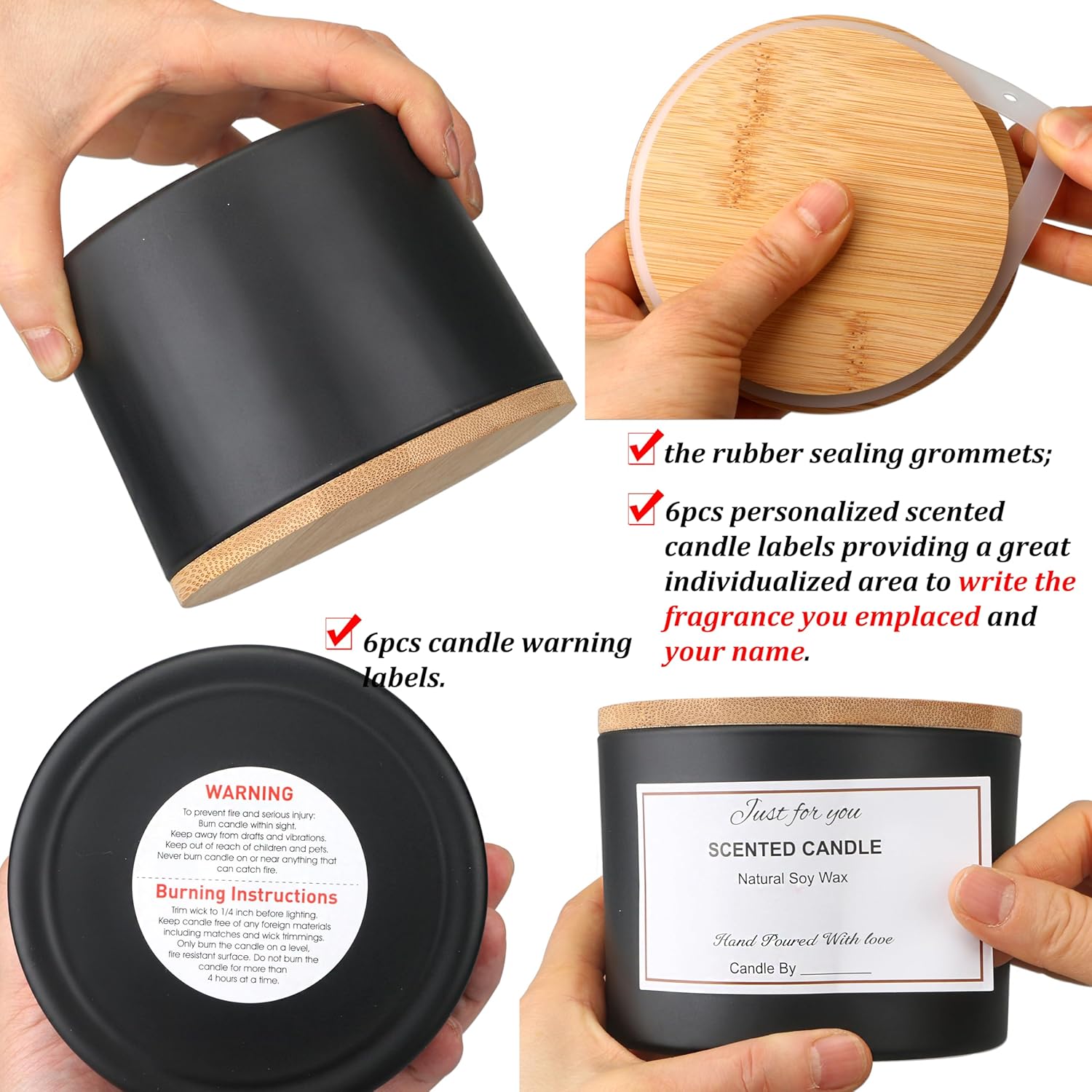 - Kaufen Sie es und Sie erhalten: 6 x schwarze, matte Gläser mit breiter Öffnung, 473 ml mit luftdichtem Bambusdeckel, 20 x 8,9 cm Kerzendocht-Aufkleber, 6 x 7-Loch-Holzkerzendochthalter, 6 x Kerzendocht-Etiketten, 1 x Kerzendocht-Platzierungsröhren, 6