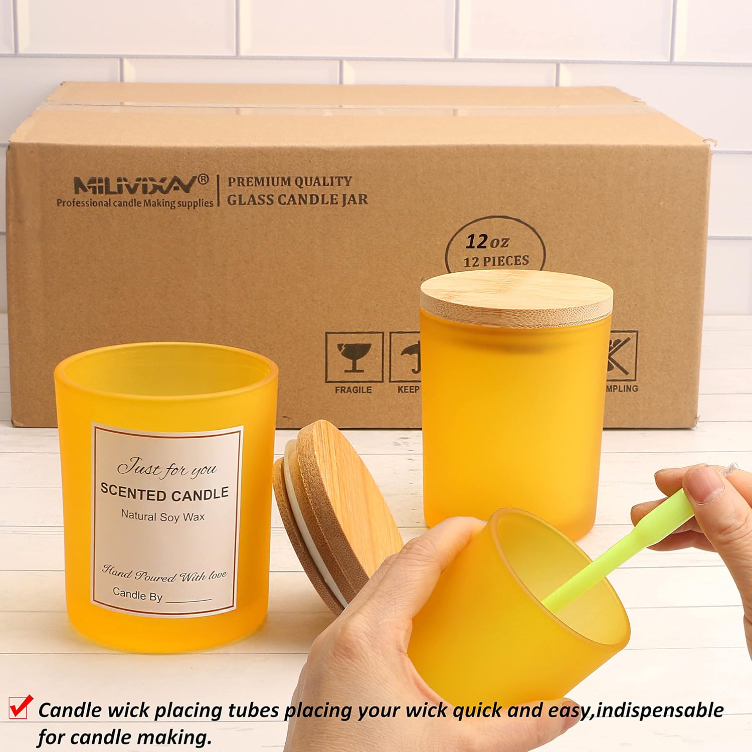 - ▶️ Beim Kauf erhältst du folgendes: 12 x Gläser in 6 verschiedenen Farben mit luftdichten Bambusdeckeln, 20 x 15 cm lange Kerzendochte, 20 x Kerzendocht-Aufkleber, 20 x Dochthalter, 12 x Warnetiketten für Kerzen, 12 x Kerzenboxen, 1 x