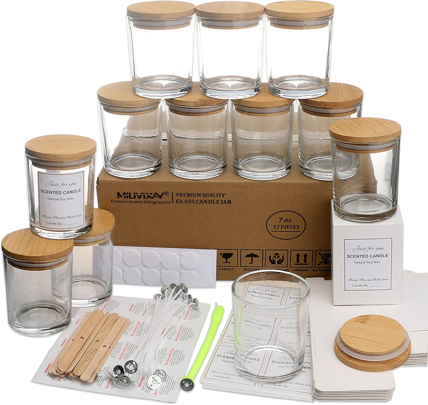 - ▶️ Beim Kauf erhältst du folgendes: 12 x klare Gläser mit luftdichten Bambusdeckeln, 20 x 15 cm lange Kerzendochte, 20 x Kerzendocht-Aufkleber, 12 x Dochthalter, 12 x Warnetiketten für Kerzen, 12 x Kerzenboxen, 1 x Kerzendocht-Einführröhrchen,