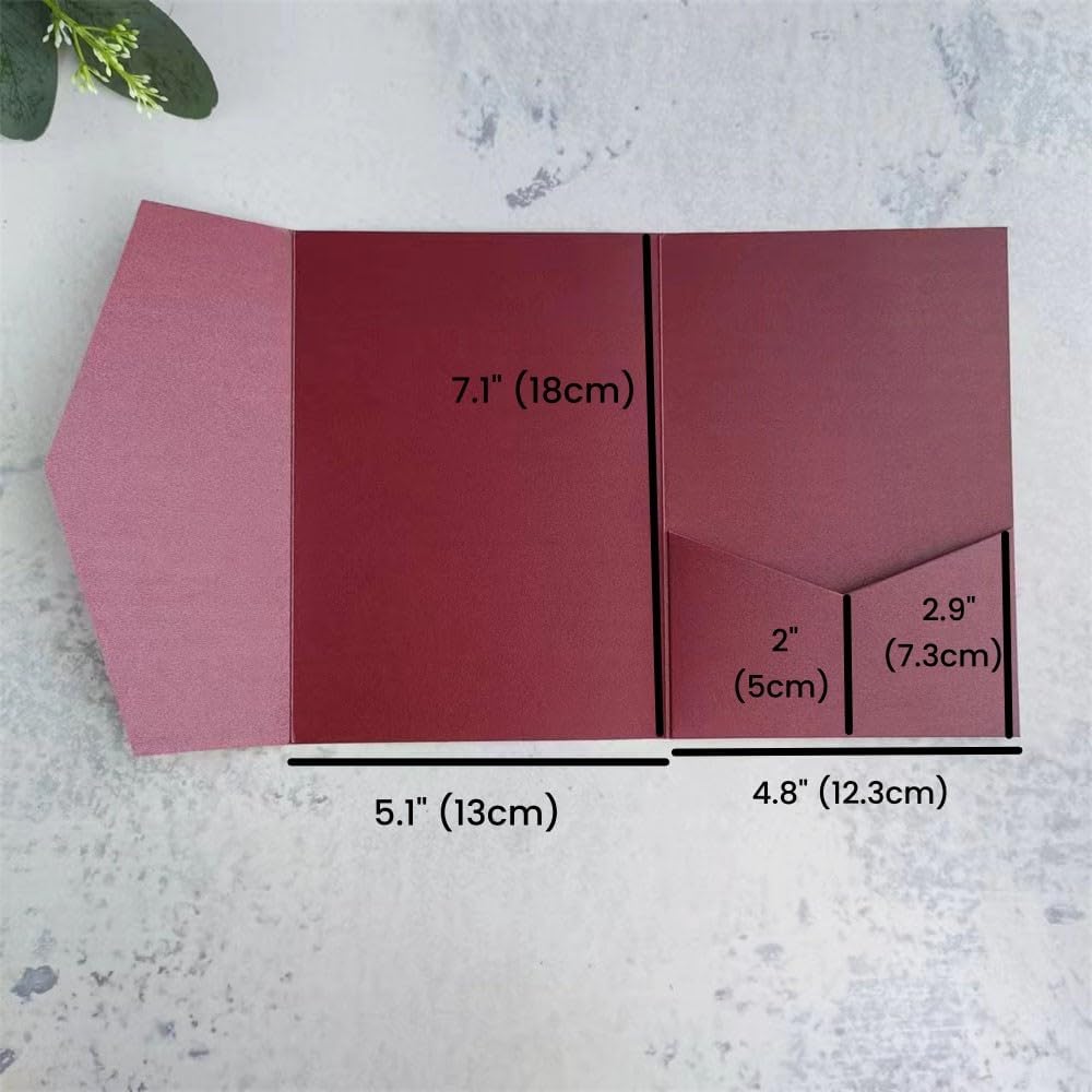 • Dieser burgunderrote Umschlag misst 5,1 x 7,1 Zoll und bietet Platz für Einladungen mit einer Grösse von 5 x 7 cm.