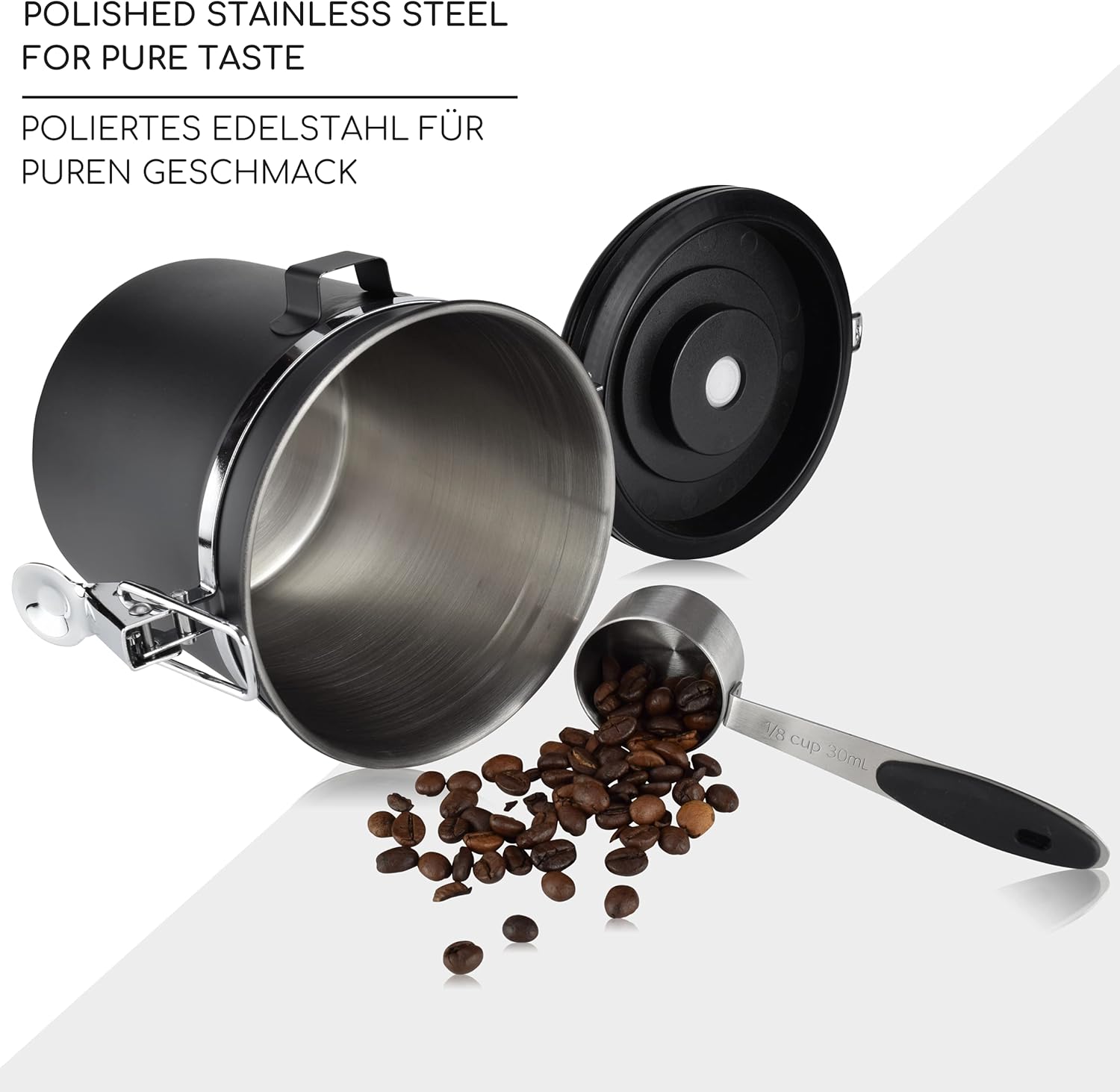 - DICHTUNGSDESIGN: Der Silikondichtungsring zwischen Deckel und Behälter sorgt für eine stärkere Abdichtung, was die Kaffeebohnen vor Luftverschmutzung und Oxydation schützt.
